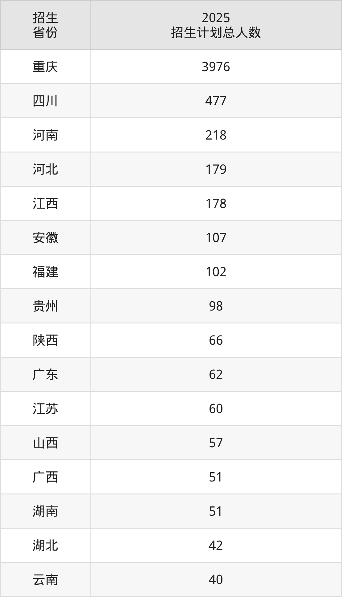 2025年重庆理工大学面向全国28个省市开展本科招生;招生专业共57个,招生人数共5987人。2025年在重庆市招生计划总人数是3976人,其中,重庆理工大学在重庆市招生人数最多的是计算机科学与技术。重庆理工大学在各省具体招生人数情况如下表。