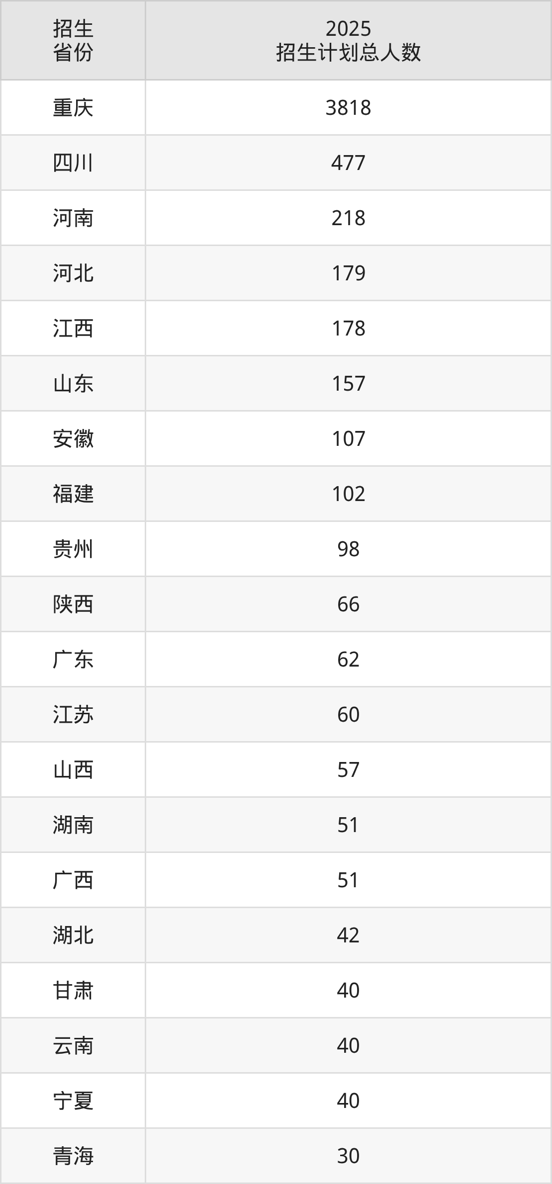 2025年重庆理工大学面向全国29个省市开展本科招生;招生专业共57个,招生人数共5986人。2025年在重庆市招生计划总人数是3818人,其中,重庆理工大学在重庆市招生人数最多的是计算机科学与技术。重庆理工大学在各省具体招生人数情况如下表。