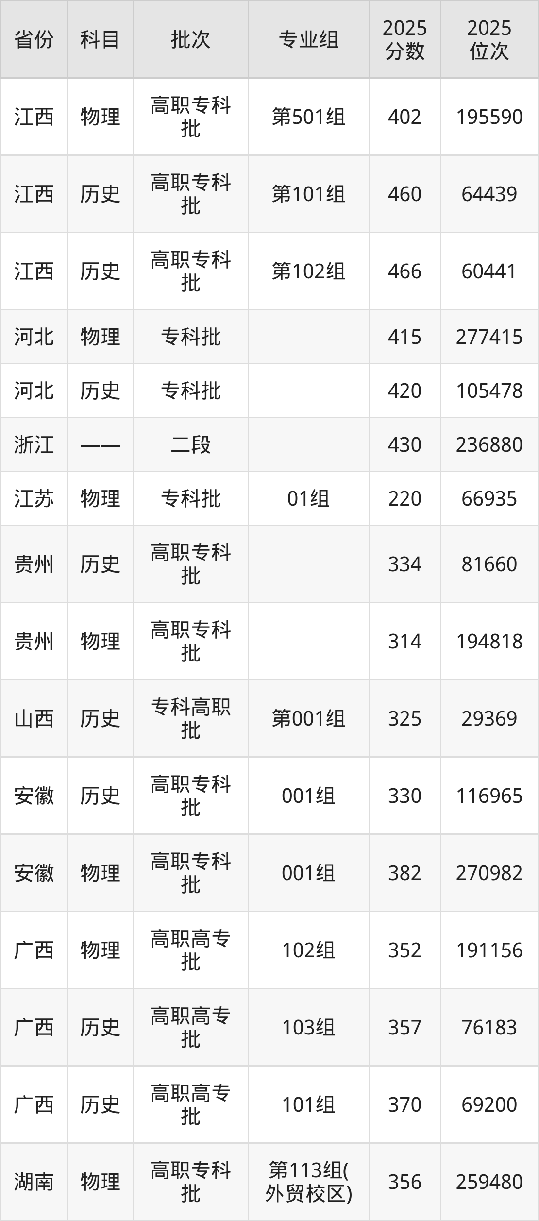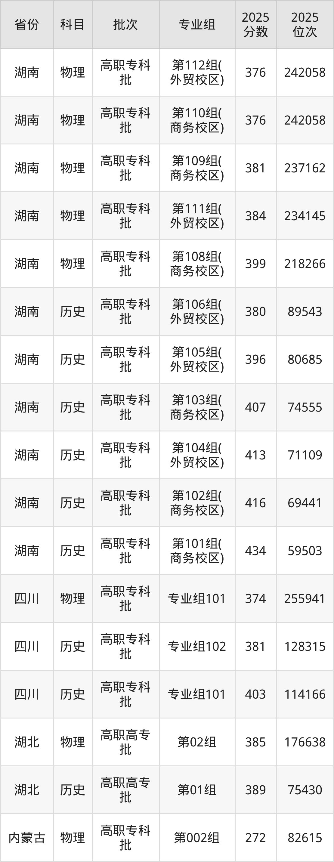 湖南商务职业技术学院专业组101:2025年投档录取最低分为403分,录取最低位次为114166名。