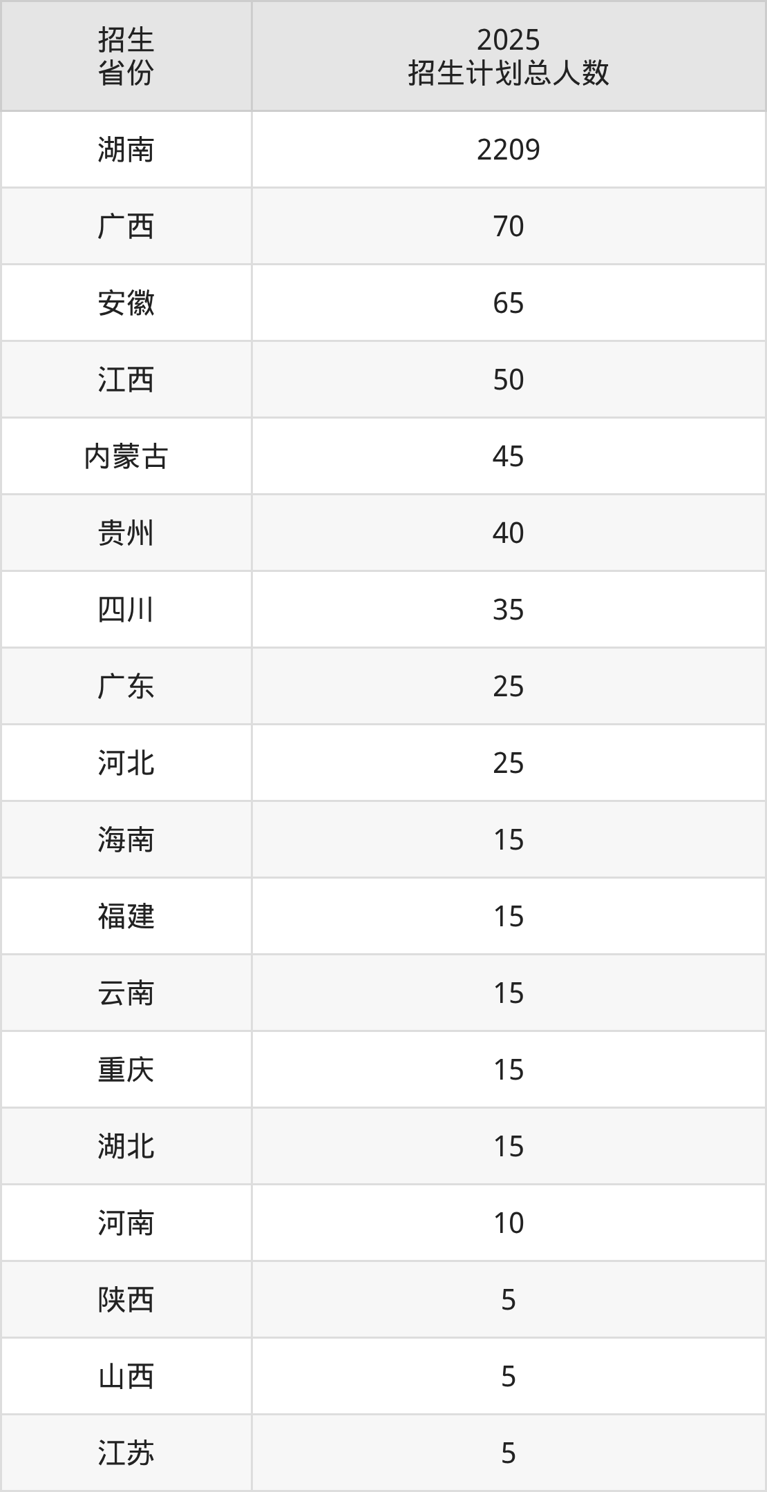 2025年湖南商务职业技术学院面向全国18个省市开展专科招生;招生专业共43个,招生人数共2664人。2025年在湖南省招生计划总人数是2209人,其中,湖南商务职业技术学院在湖南省招生人数最多的是大数据与会计。湖南商务职业技术学院在各省具体招生人数情况如下表。