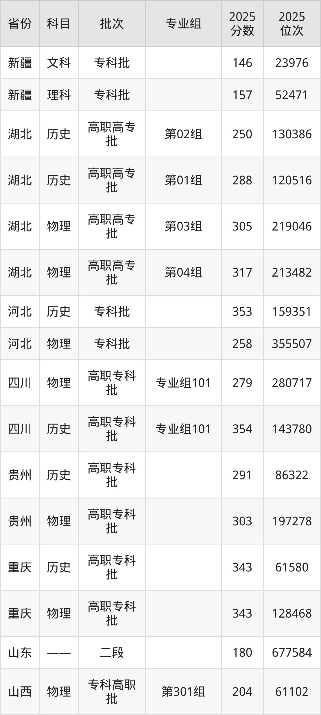2025年甘肃有色冶金职业技术学院全国录取分数线是146分到363分,录取最低在新疆文科、录取最高在内蒙古历史类(第013组)。各省各专业组最低分具有差异,详情如下: