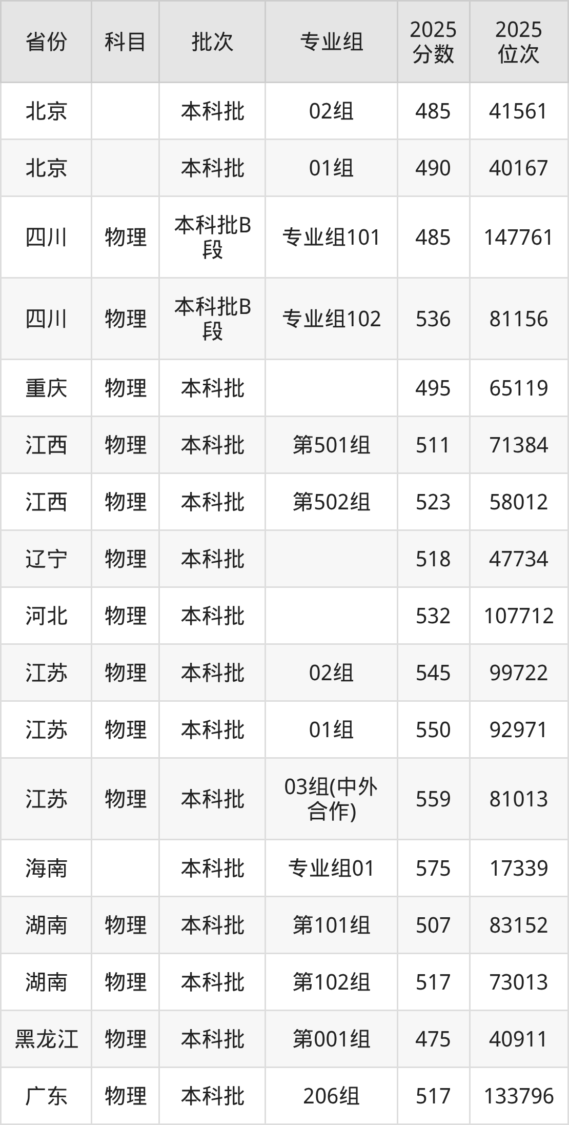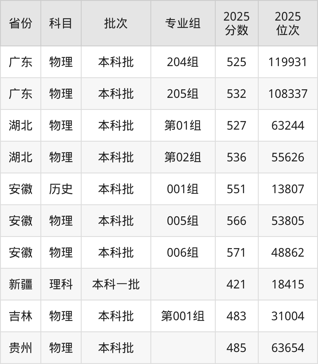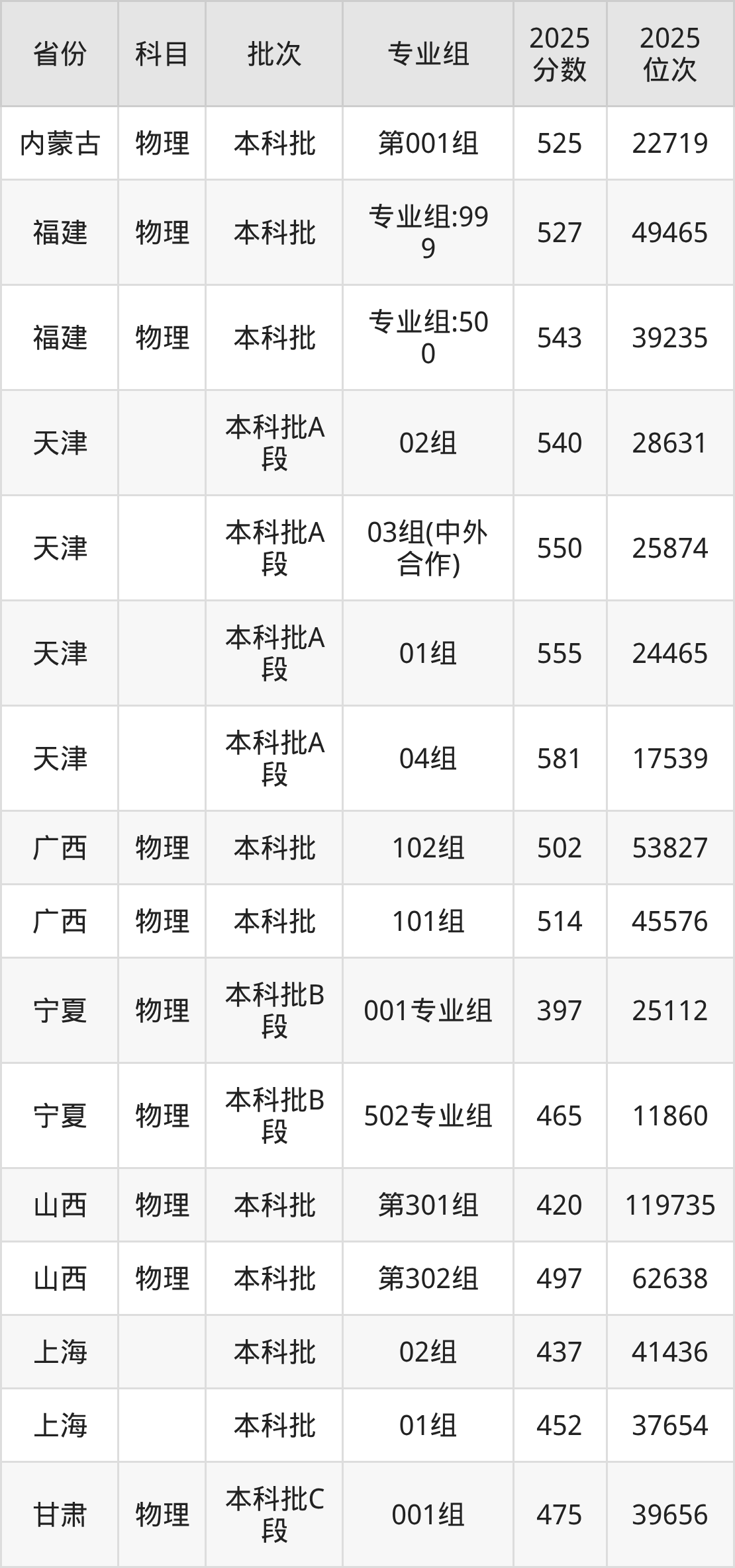2025年在本科物理类进行招生,各专业组分数线详情如下: