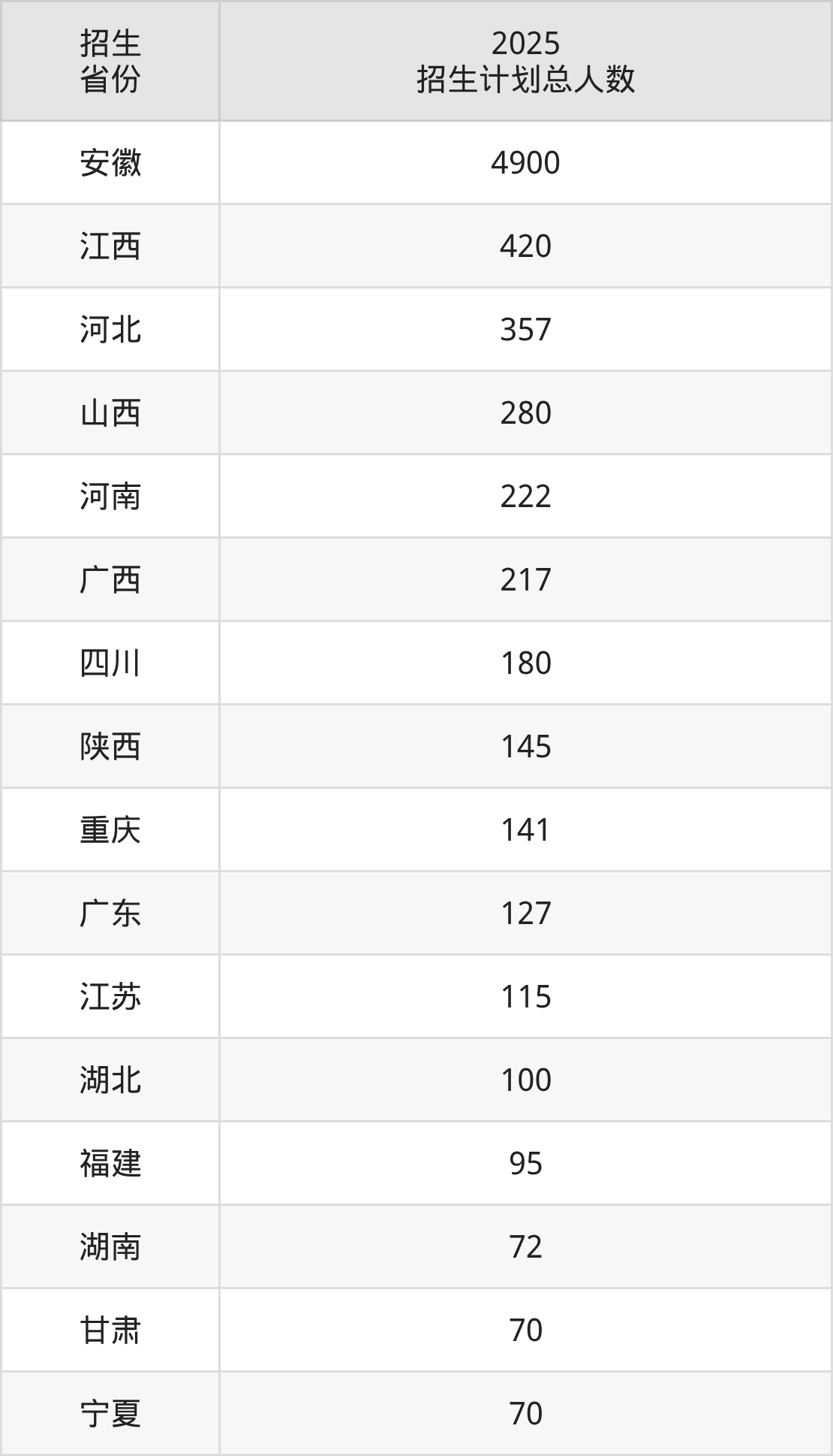 2025年安徽理工大学面向全国27个省市开展本科招生;招生专业共65个,招生人数共7843人。2025年在安徽省招生计划总人数是4900人,其中,安徽理工大学在安徽省招生人数最多的是机械设计制造及其自动化。安徽理工大学在各省具体招生人数情况如下表。