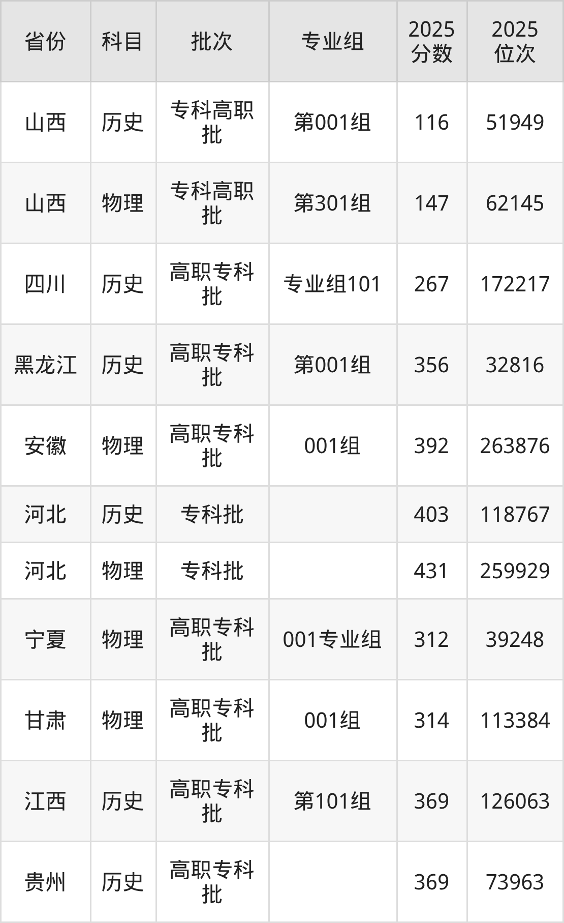 2025年在专科物理类进行招生,各专业组分数线详情如下: