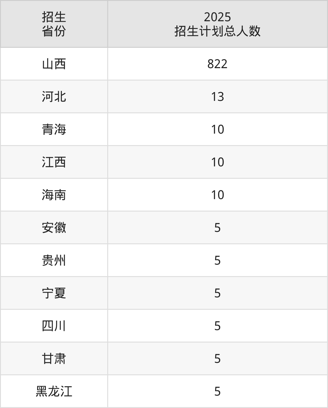 2025年山西老区职业技术学院面向全国11个省市开展专科招生;招生专业共13个,招生人数共895人。2025年在山西省招生计划总人数是822人,其中,山西老区职业技术学院在山西省招生人数最多的是护理。山西老区职业技术学院在各省具体招生人数情况如下表。