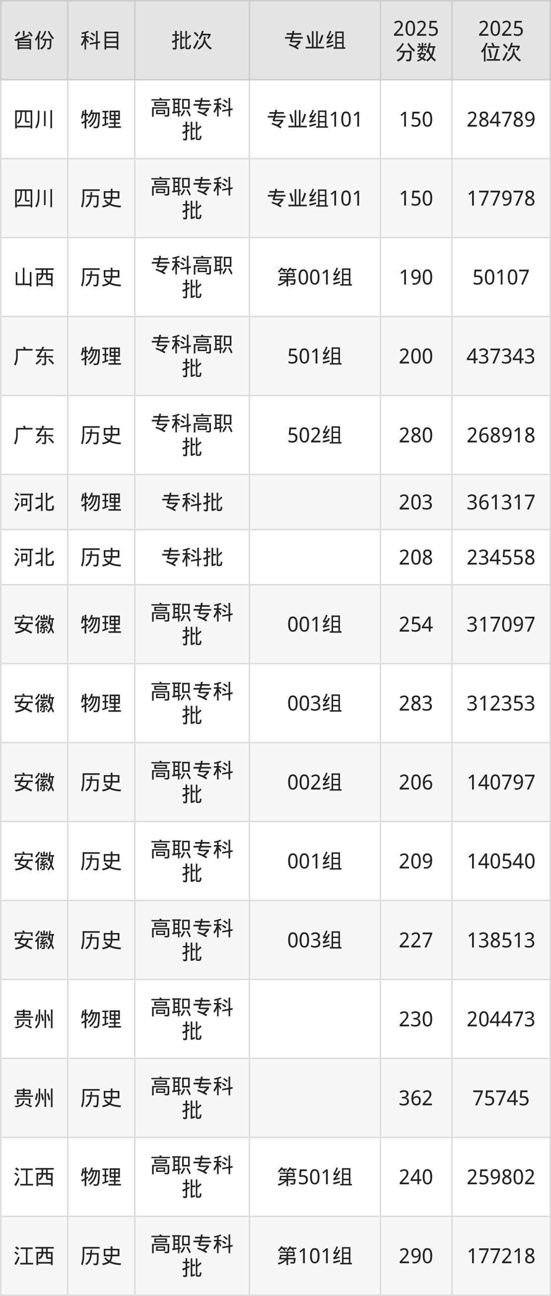2025年广东创新科技职业学院全国录取分数线是150分到362分,录取最低在四川物理类(专业组101)、录取最高在贵州历史类。各省各专业组最低分具有差异,详情如下: