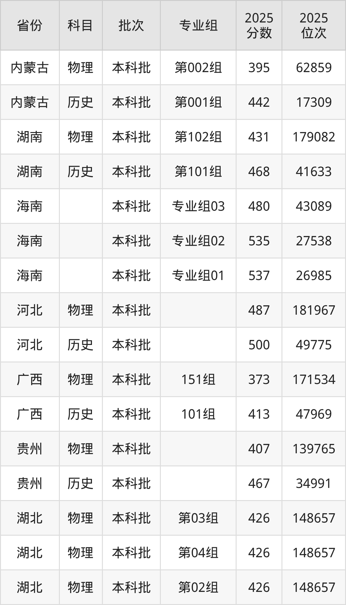 2025年荆州学院全国录取分数线是373分到537分,录取最低在广西物理类(151组)、录取最高在海南(专业组01)。各省各专业组最低分具有差异,详情如下: