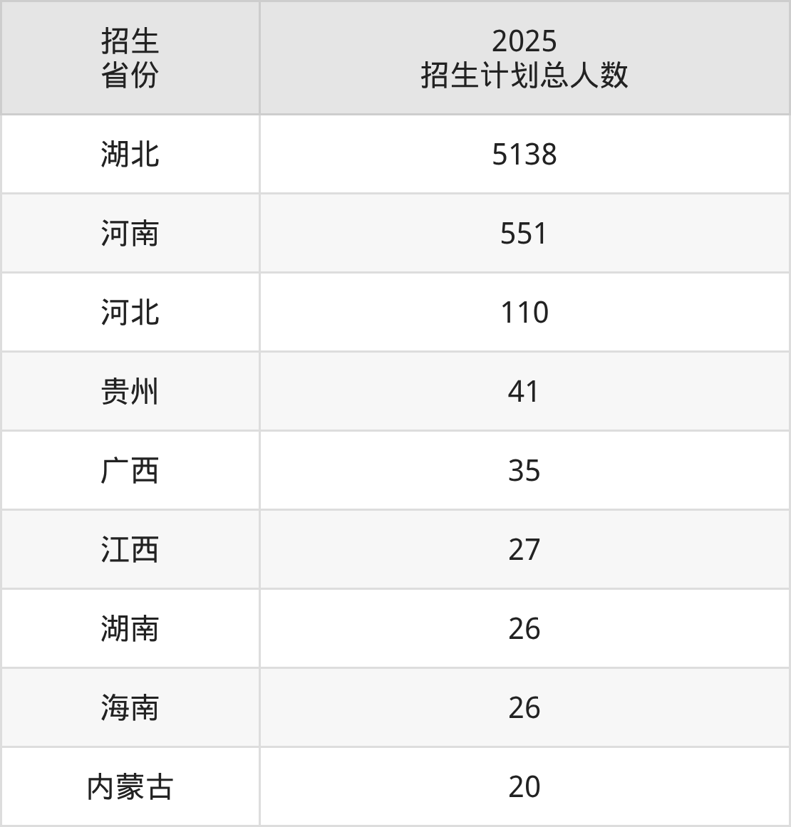 2025年荆州学院面向全国9个省市开展本科招生;招生专业共32个,招生人数共1964人。2025年在湖北省招生计划总人数是5138人,其中,荆州学院在湖北省招生人数最多的是机电一体化技术。荆州学院在各省具体招生人数情况如下表。
