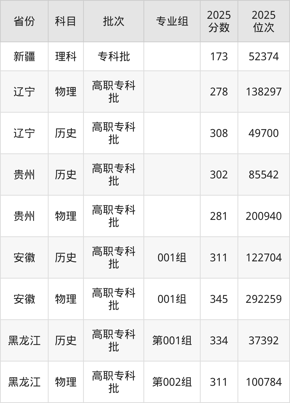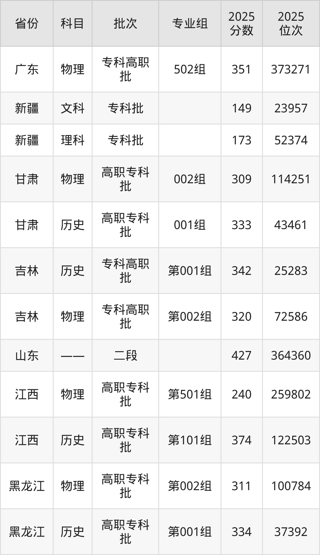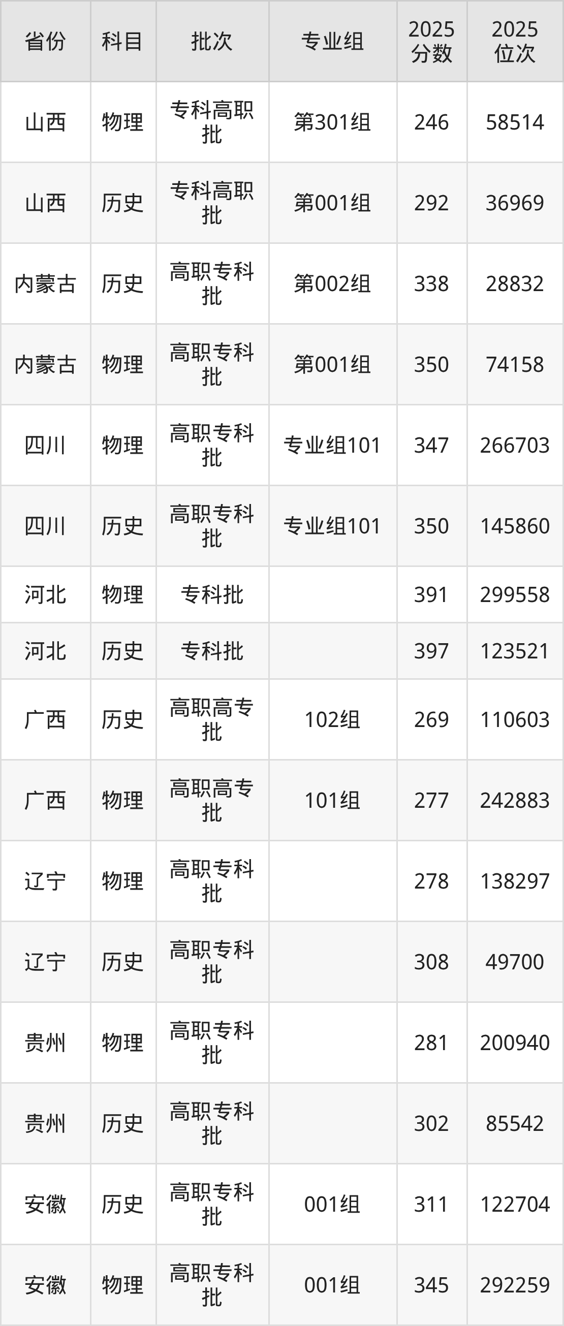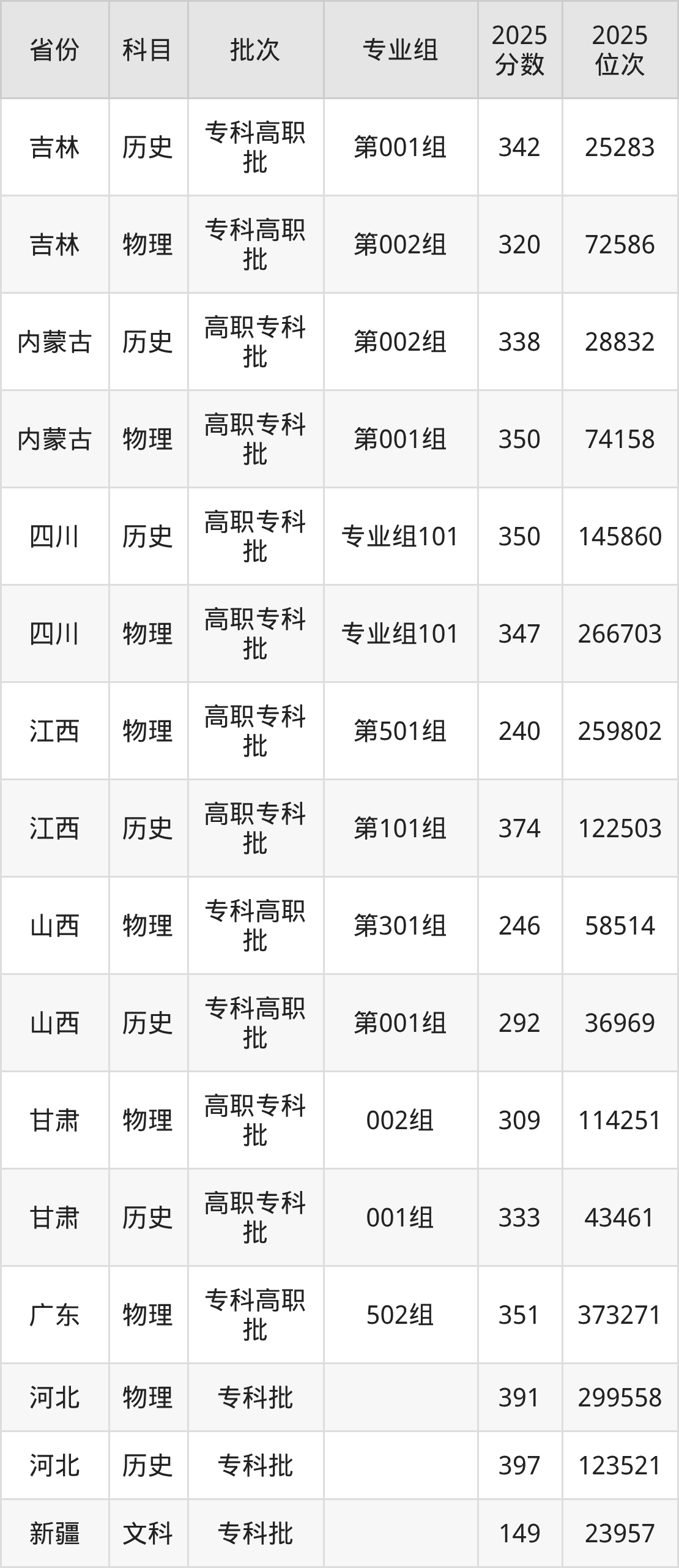 2025年在专科物理类进行招生,各专业组分数线详情如下: