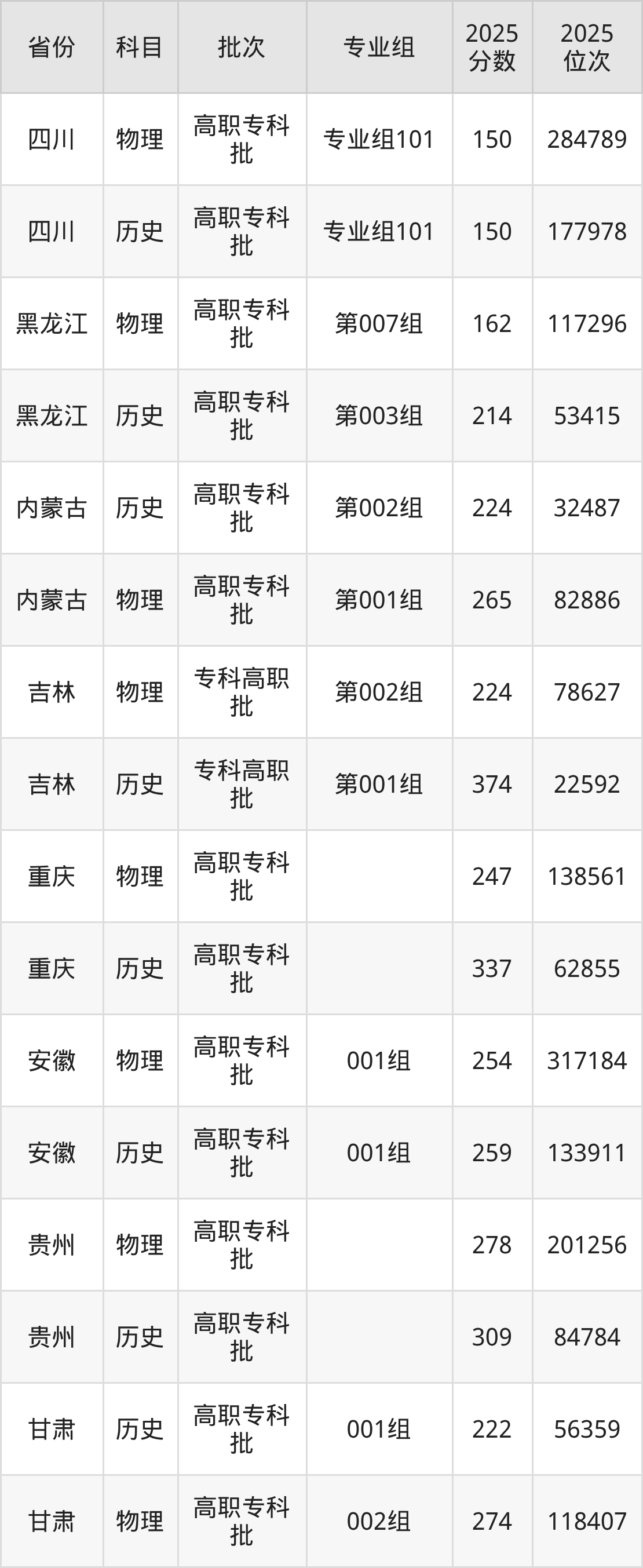 普通类专科物理类最低224分,专科历史类最低374分