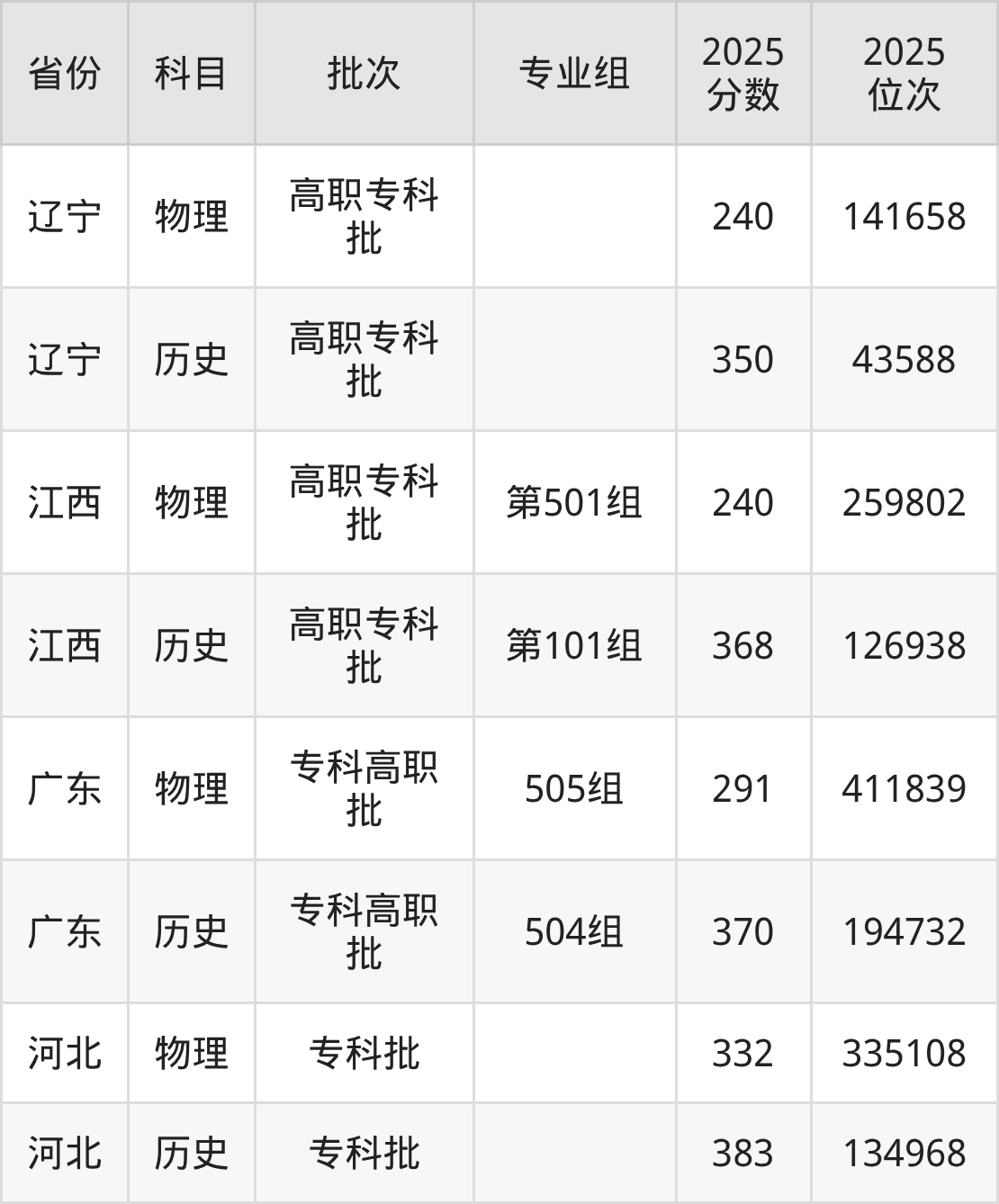 普通类专科物理类最低254分,专科历史类最低259分