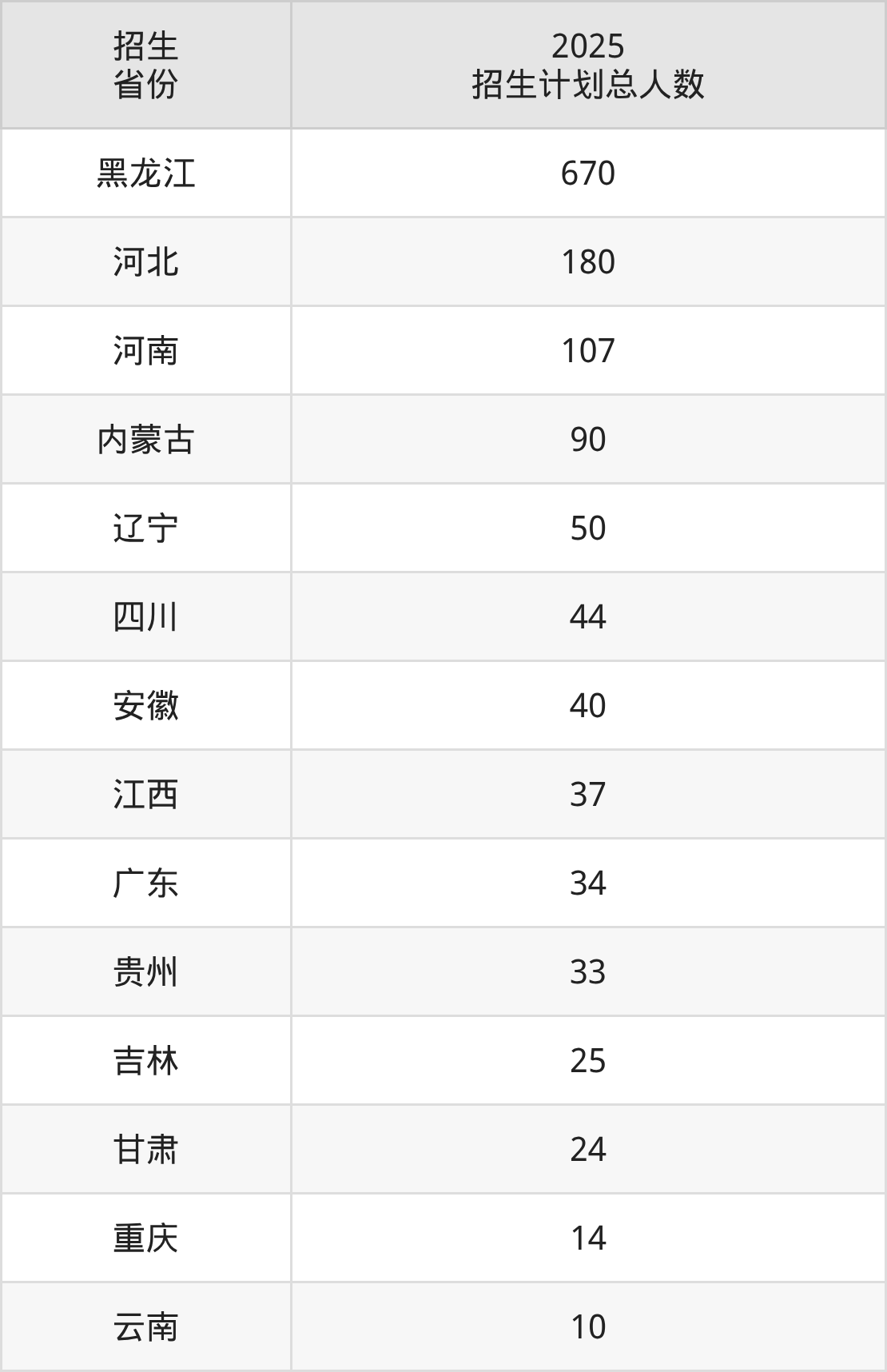 2025年黑龙江幼儿师范高等专科学校面向全国14个省市开展专科招生;招生专业共11个,招生人数共1358人。2025年在黑龙江省招生计划总人数是670人,其中,黑龙江幼儿师范高等专科学校在黑龙江省招生人数最多的是学前教育。黑龙江幼儿师范高等专科学校在各省具体招生人数情况如下表。