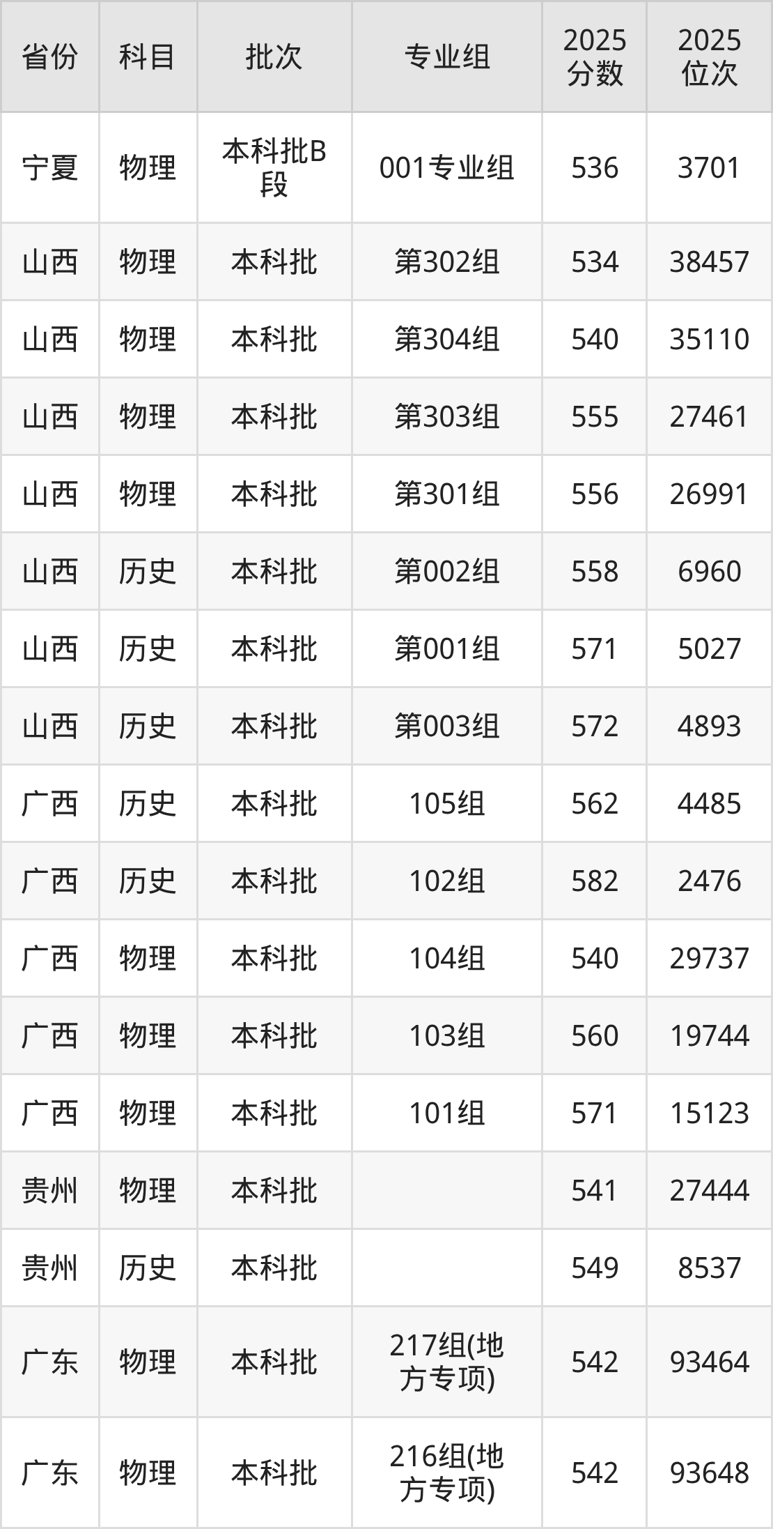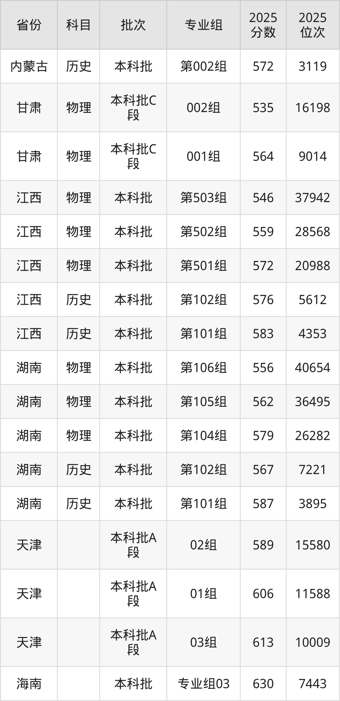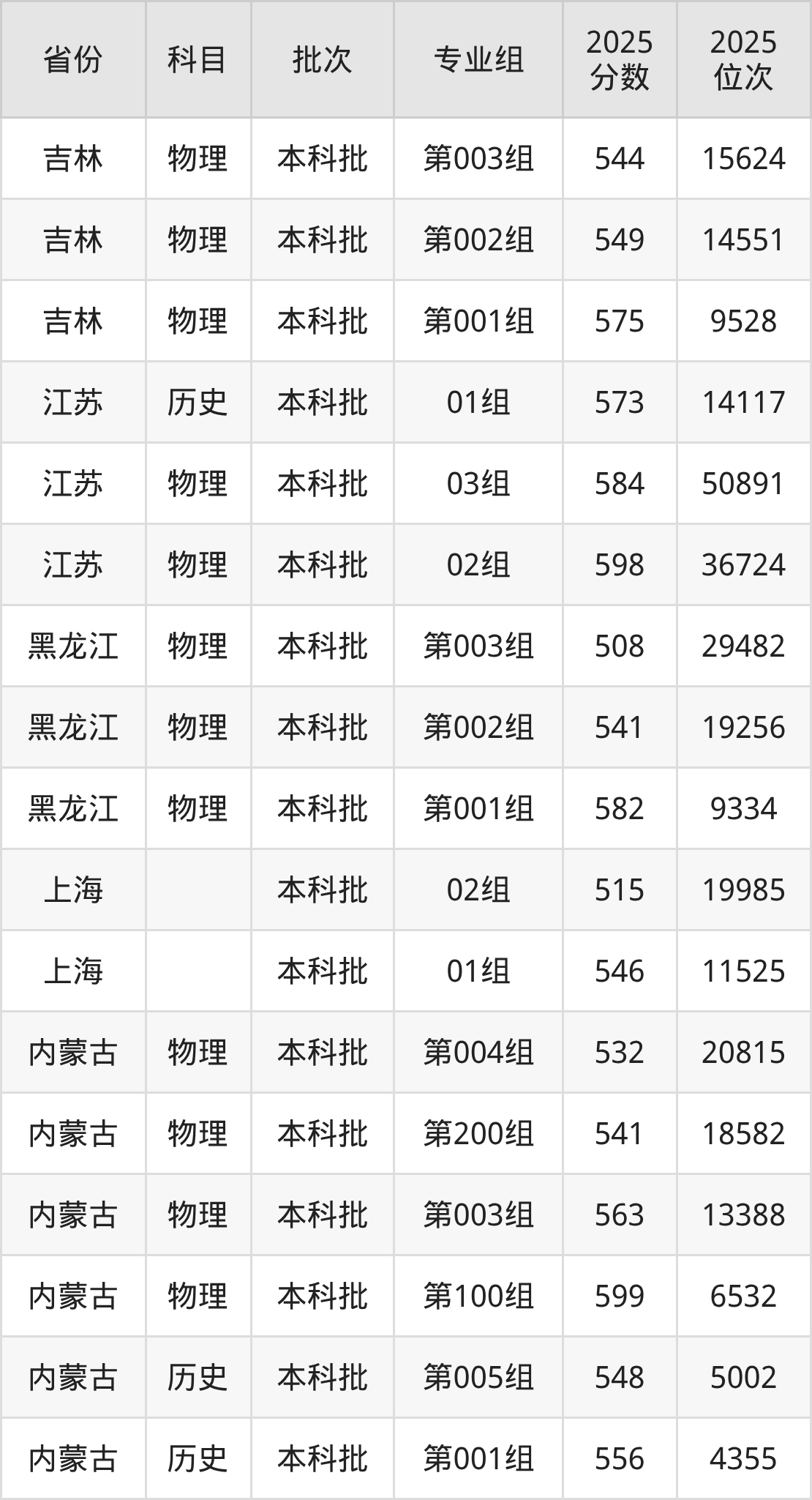2025年在本科物理类进行招生,各专业组分数线详情如下: