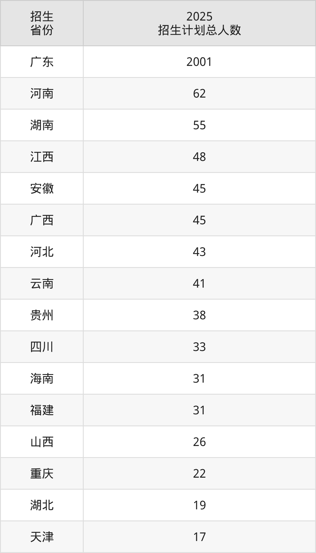 2025年广州中医药大学面向全国28个省市开展本科招生;招生专业共23个,招生人数共2676人。2025年在广东省招生计划总人数是2001人,其中,广州中医药大学在广东省招生人数最多的是中医学。广州中医药大学在各省具体招生人数情况如下表。