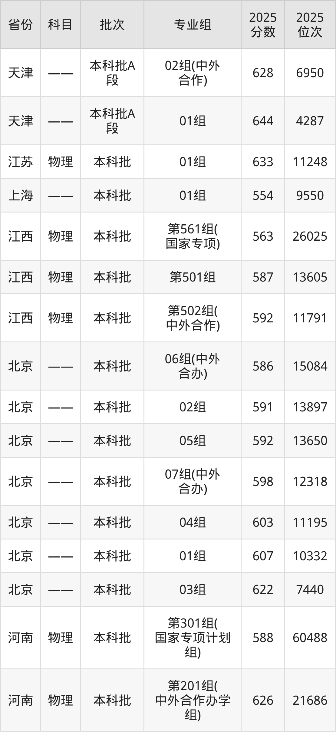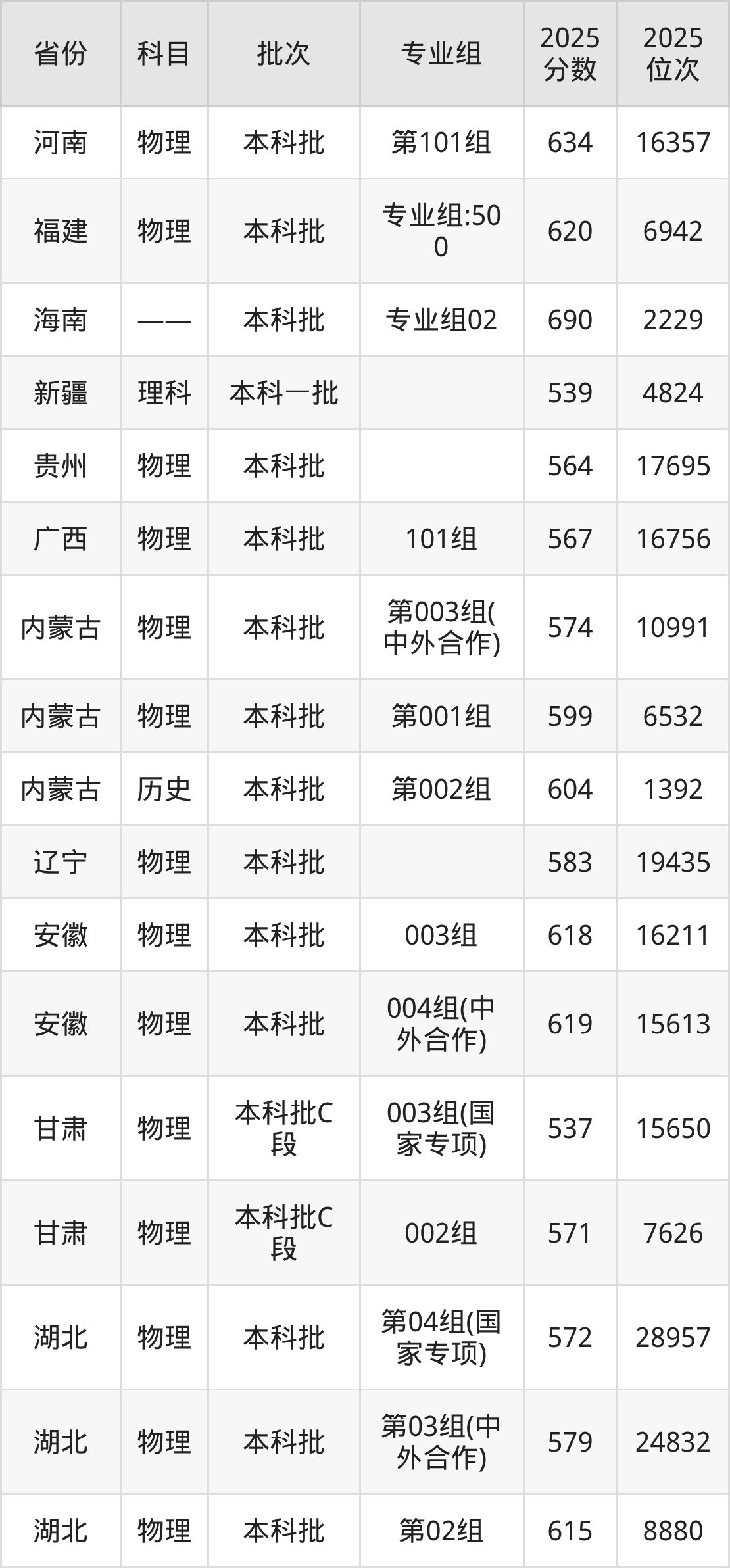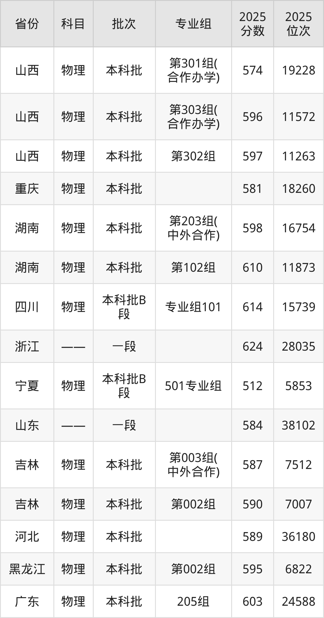 2025年在本科物理类进行招生,各专业组分数线详情如下: