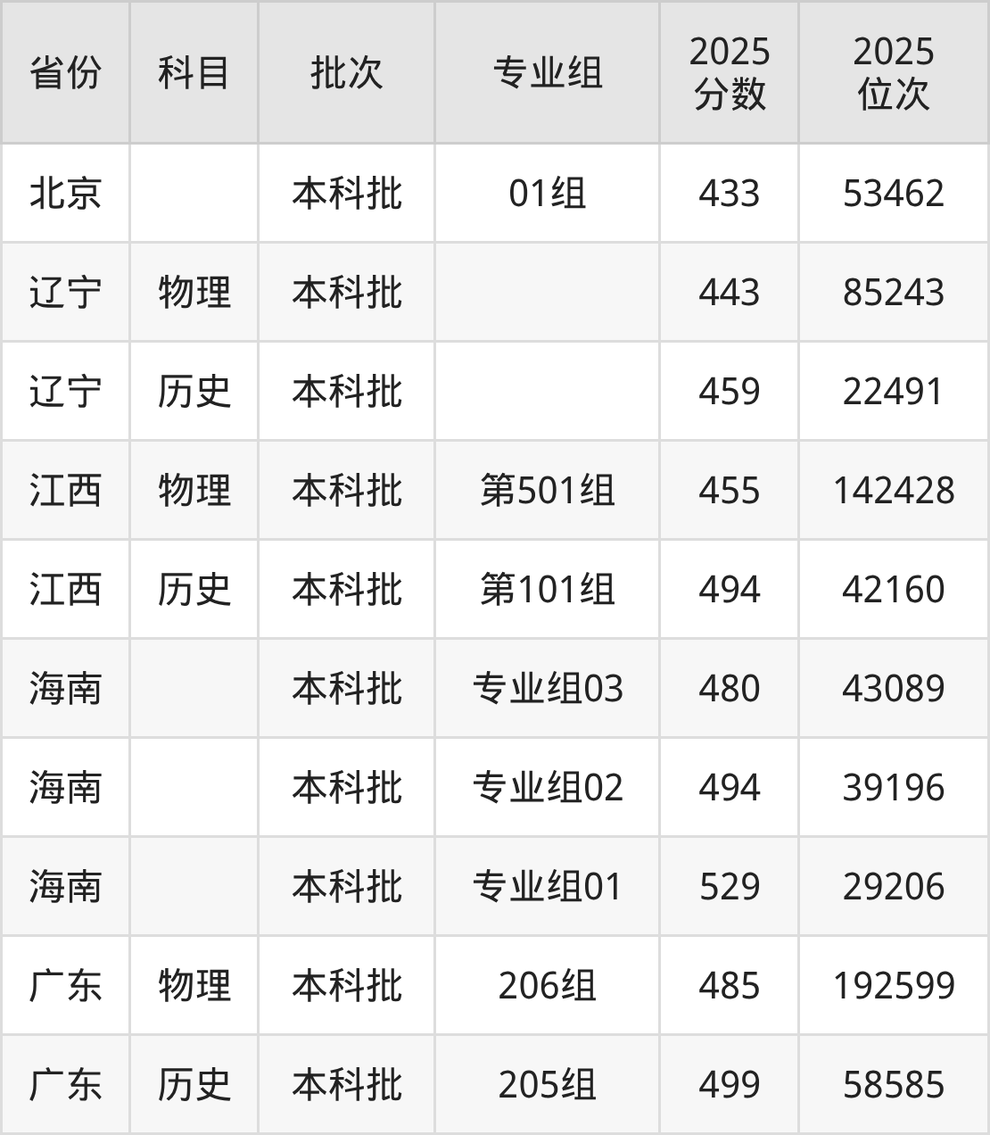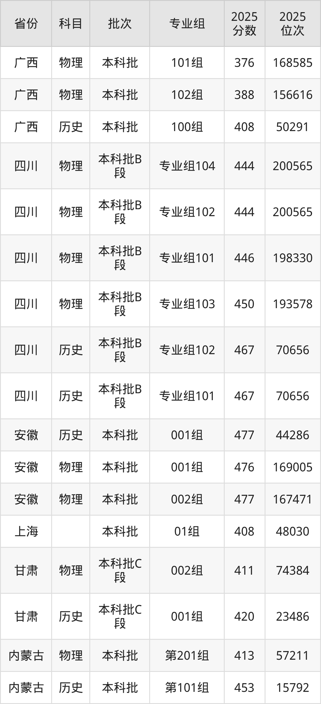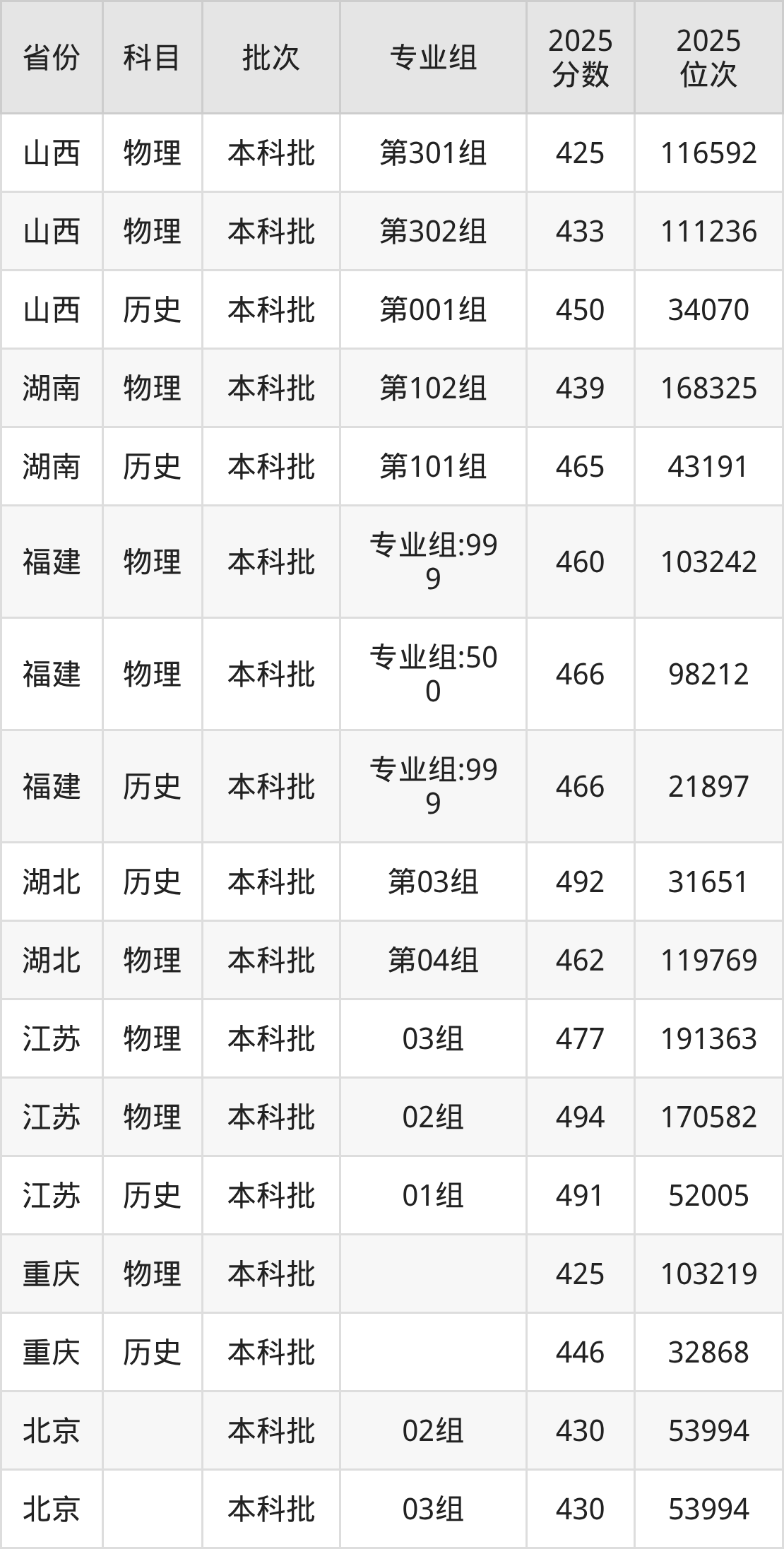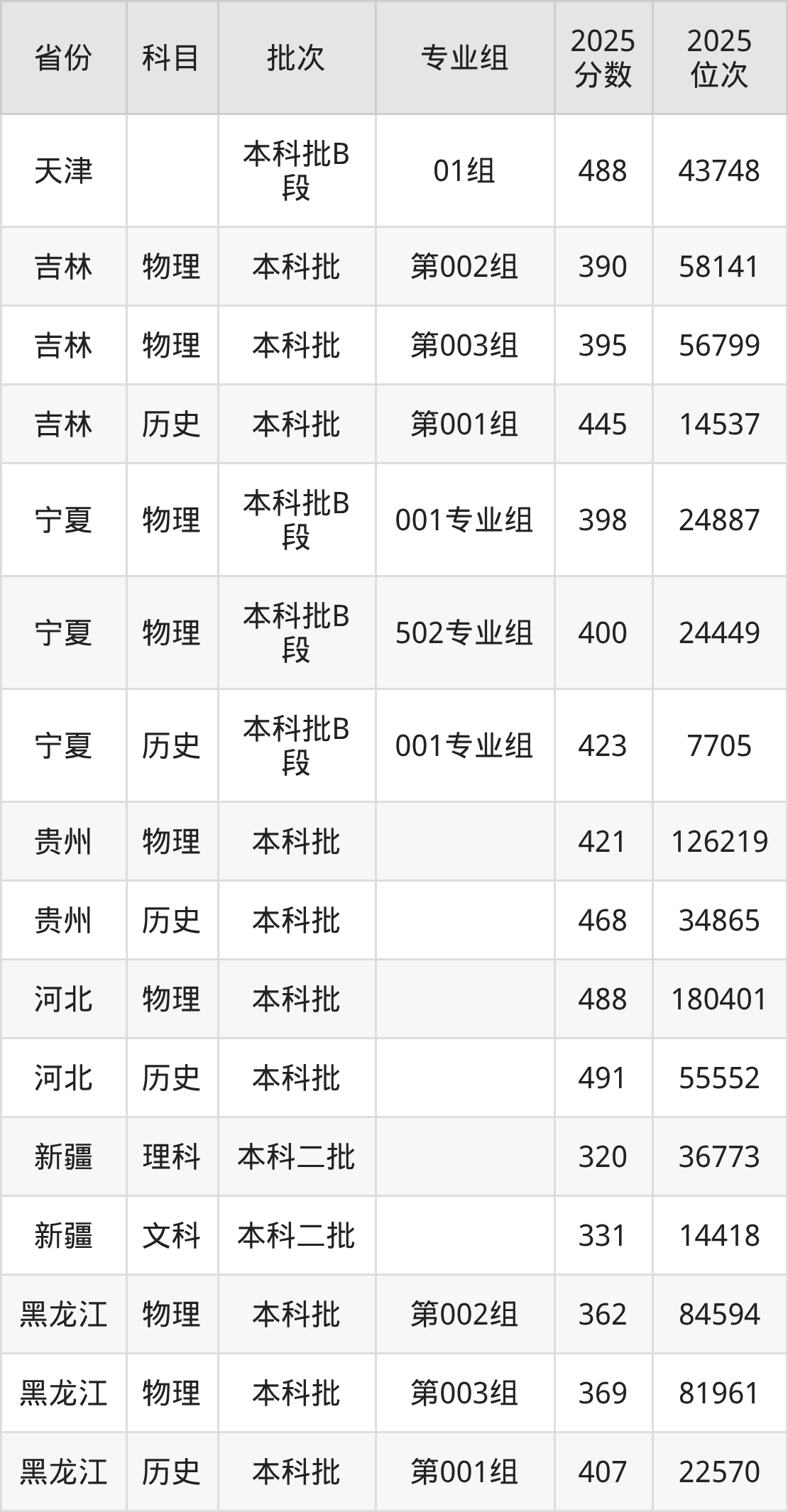 2025年投档录取最低分为320分,录取最低位次为36773名。