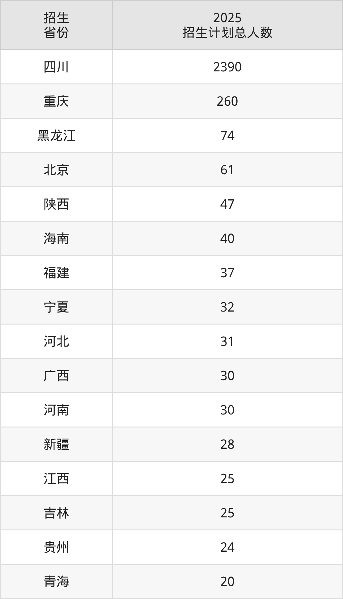 2025年吉利学院面向全国28个省市开展本科招生;招生专业共28个,招生人数共3285人。2025年在四川省招生计划总人数是2390人,其中,吉利学院在四川省招生人数最多的是计算机类。吉利学院在各省具体招生人数情况如下表。