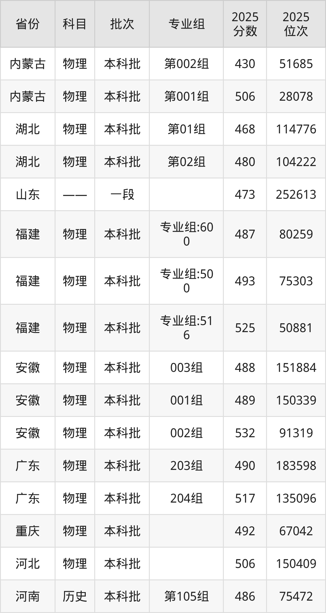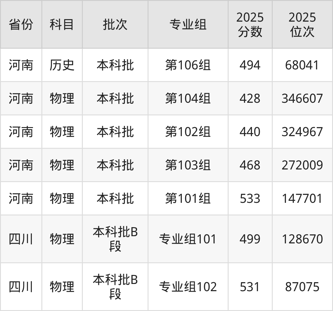 2025年在本科物理类进行招生,各专业组分数线详情如下: