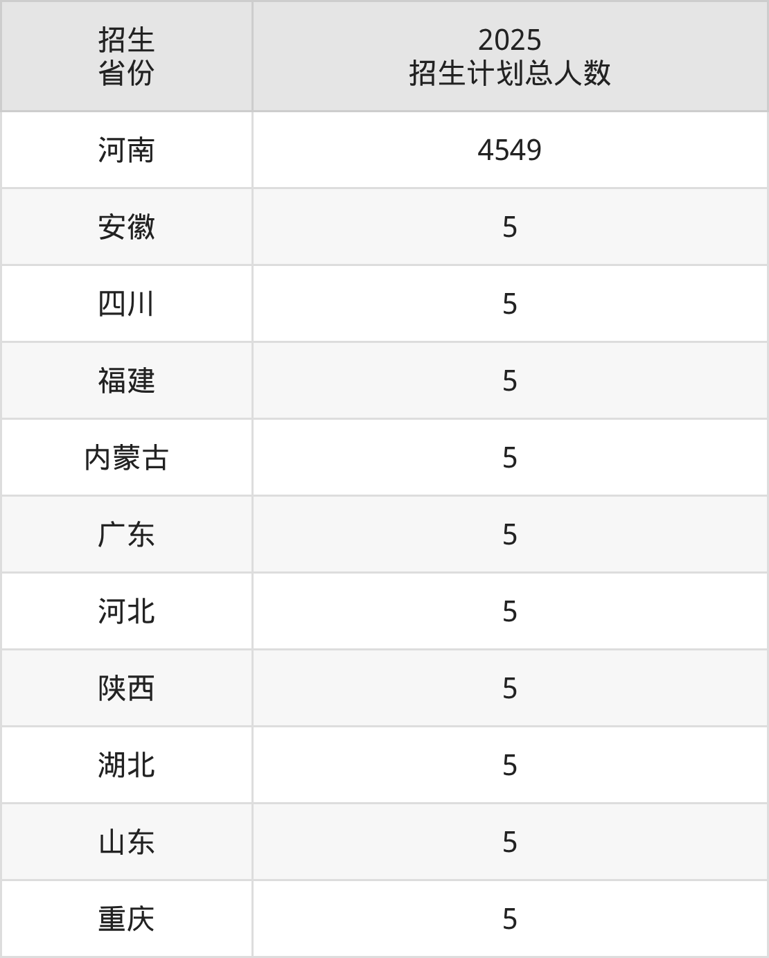2025年豫北医学院面向全国11个省市开展本科招生;招生专业共27个,招生人数共4599人。2025年在河南省招生计划总人数是4549人,其中,豫北医学院在河南省招生人数最多的是康复治疗学。豫北医学院在各省具体招生人数情况如下表。