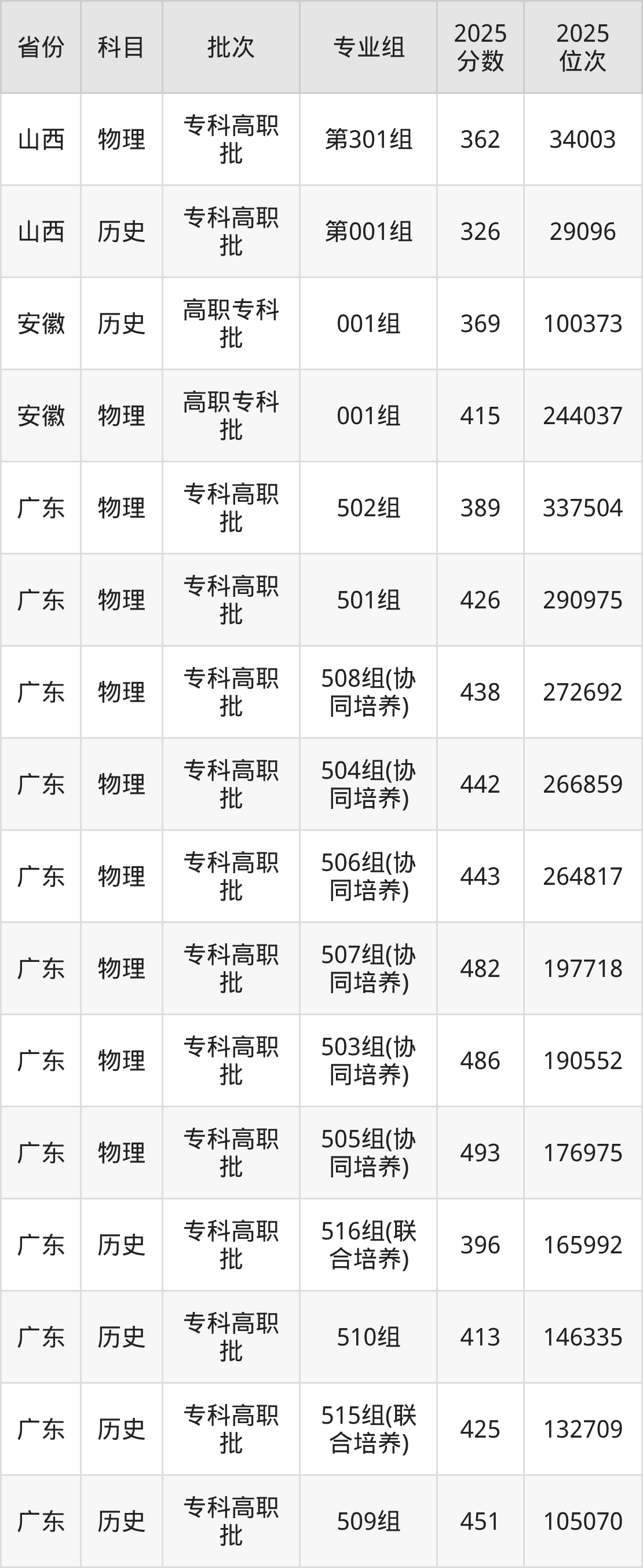 珠海城市职业技术学院专业组101:2025年投档录取最低分为449分,录取最低位次为83125名。