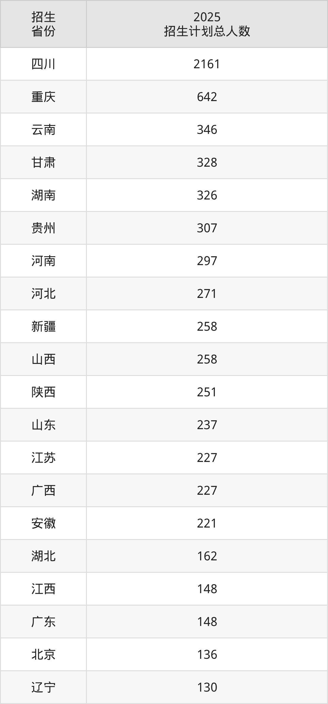 2025年四川大学面向全国29个省市开展本科招生;招生专业共43个,招生人数共7678人。2025年在四川省招生计划总人数是2161人,其中,四川大学在四川省招生人数最多的是计算机类。四川大学在各省具体招生人数情况如下表。