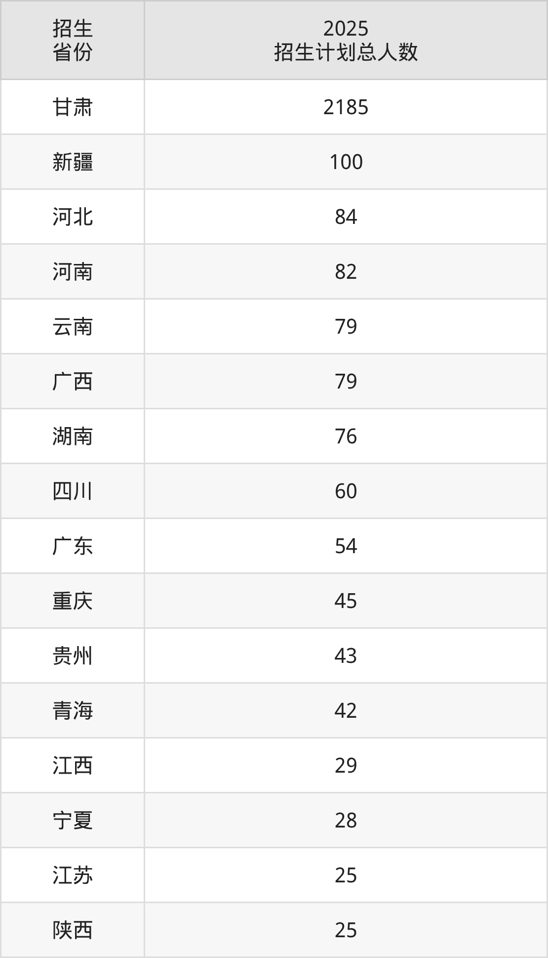 2025年甘肃中医药大学面向全国20个省市开展本科招生;招生专业共30个,招生人数共3109人。2025年在甘肃省招生计划总人数是2185人,其中,甘肃中医药大学在甘肃省招生人数最多的是临床医学。甘肃中医药大学在各省具体招生人数情况如下表。