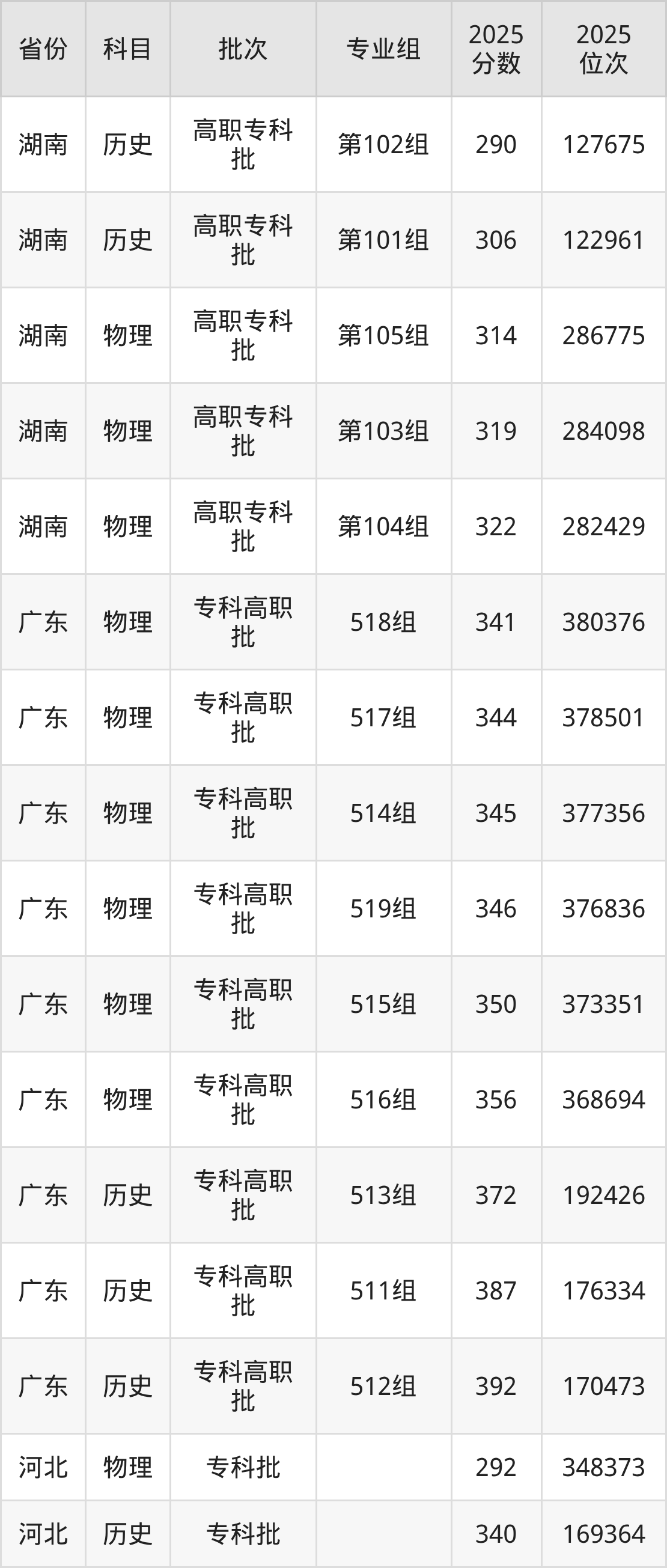 普通类专科历史类最低372分,专科物理类最低341分
