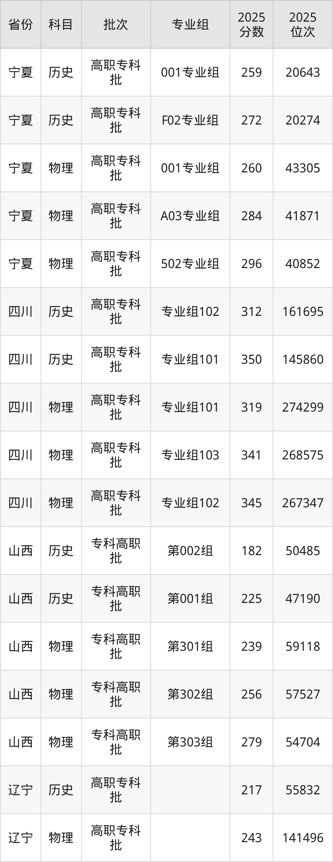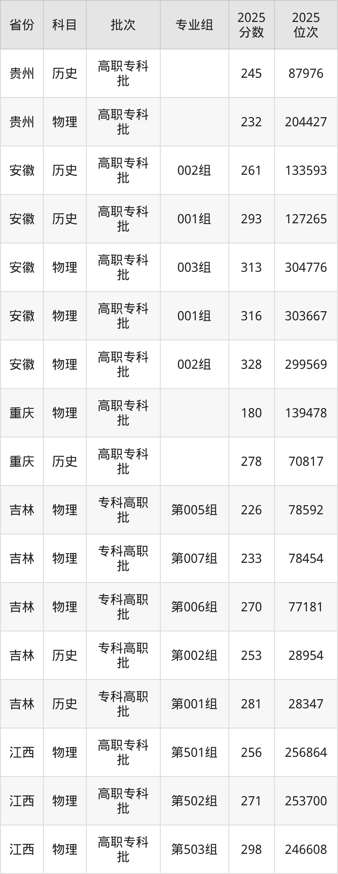 普通类专科物理类最低256分,专科历史类最低356分
