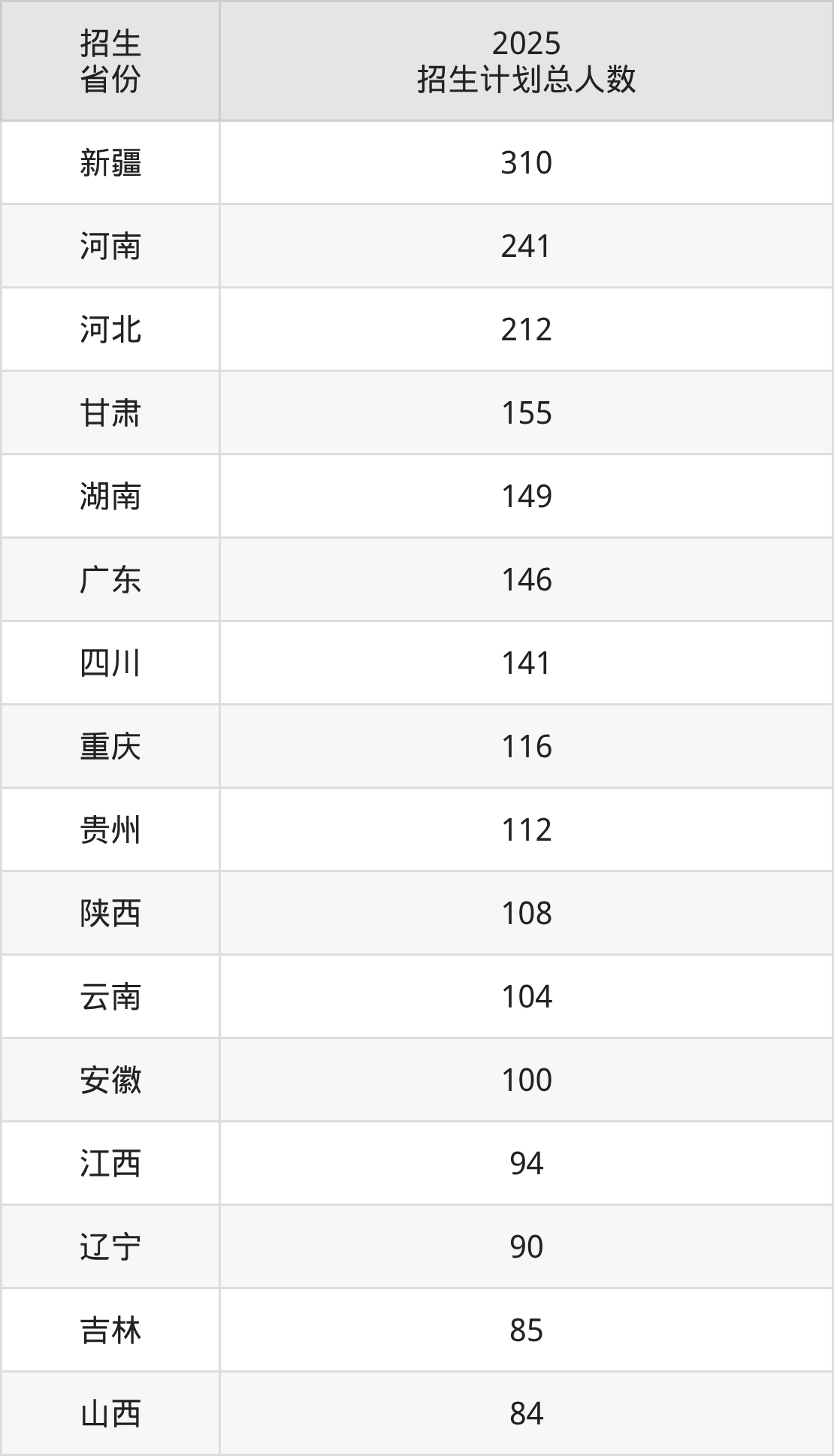 2025年喀什职业技术学院面向全国21个省市开展专科招生;招生专业共28个,招生人数共2545人。2025年在新疆维吾尔自治区招生计划总人数是310人,其中,喀什职业技术学院在新疆维吾尔自治区招生人数最多的是护理。喀什职业技术学院在各省具体招生人数情况如下表。