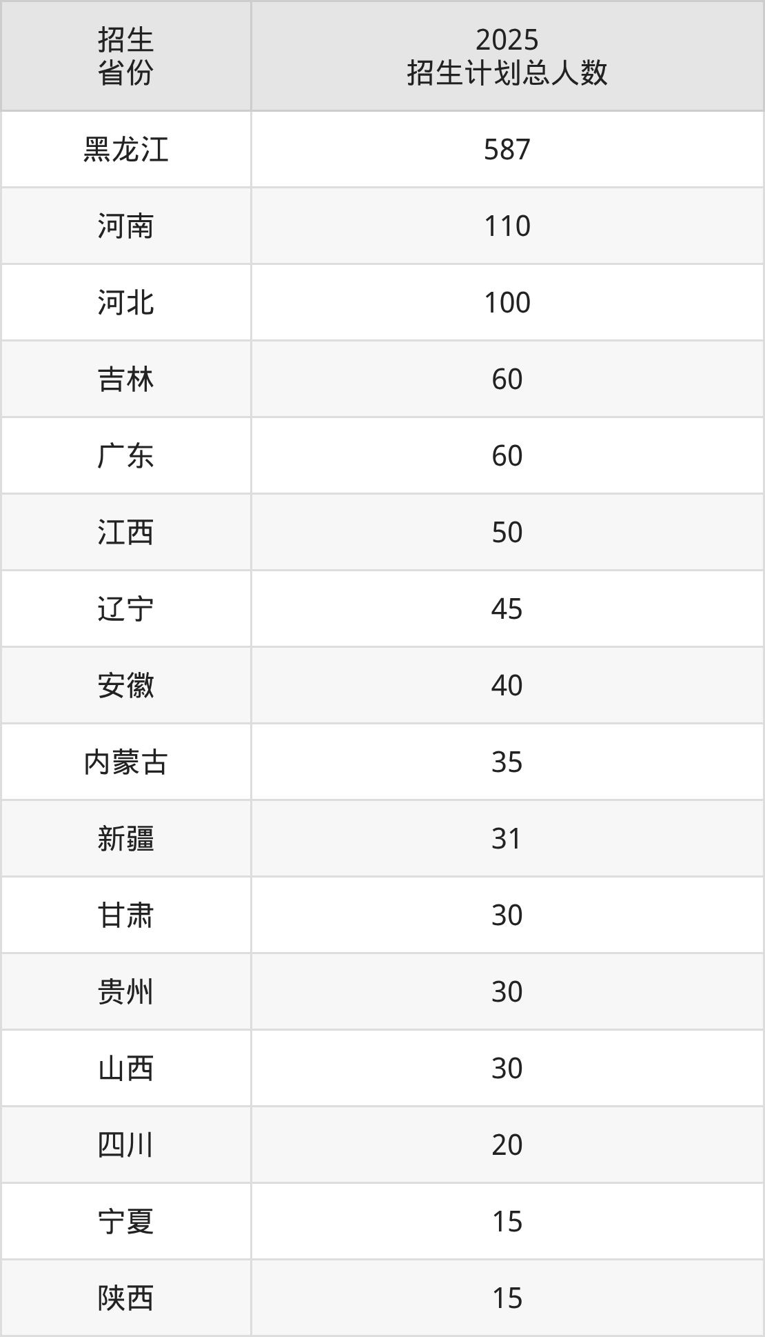 2025年大庆医学高等专科学校面向全国20个省市开展专科招生;招生专业共15个,招生人数共1293人。2025年在黑龙江省招生计划总人数是587人,其中,大庆医学高等专科学校在黑龙江省招生人数最多的是护理。大庆医学高等专科学校在各省具体招生人数情况如下表。