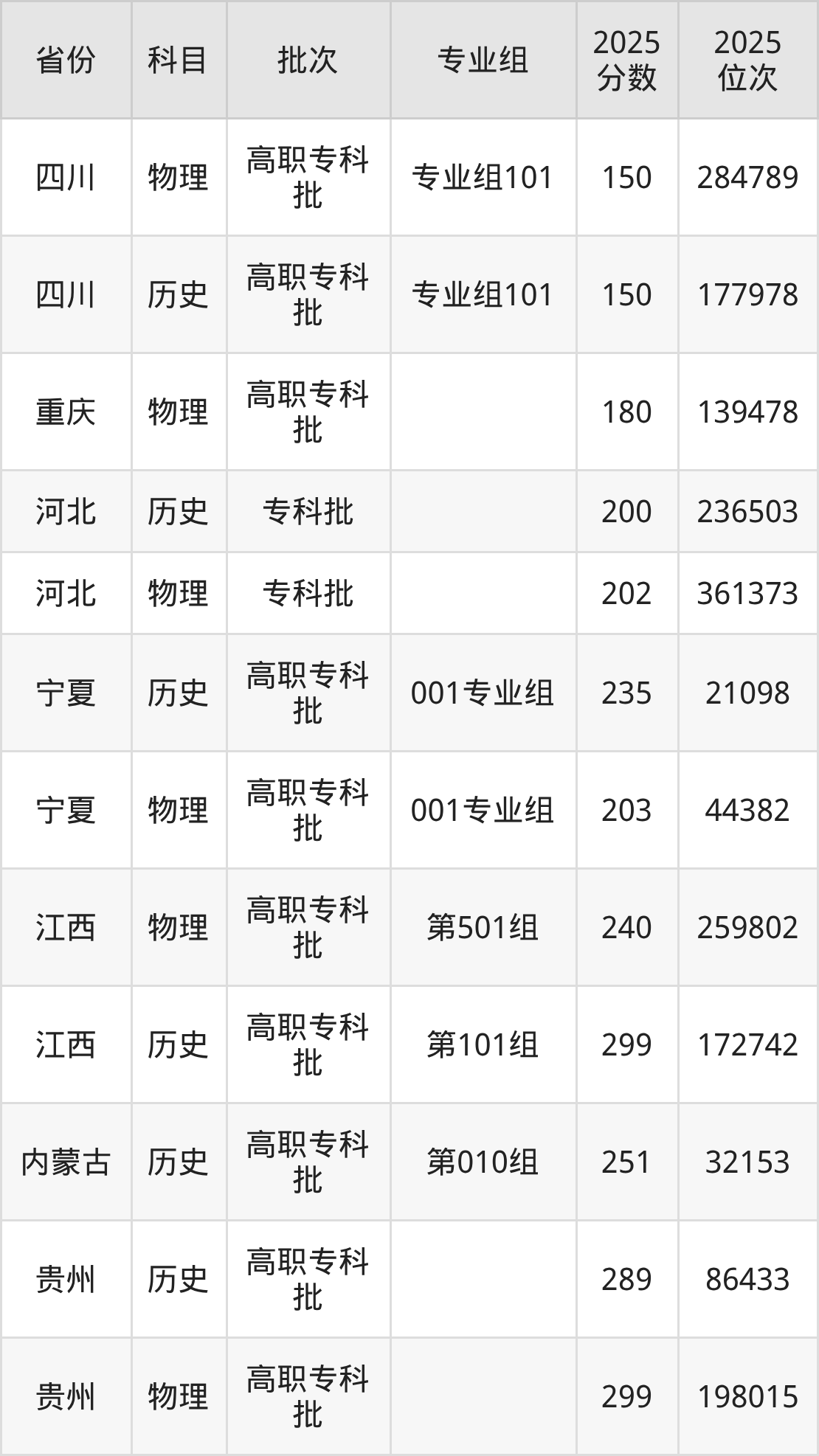 自贡职业技术学院专业组101:2025年投档录取最低分为150分,录取最低位次为177978名。