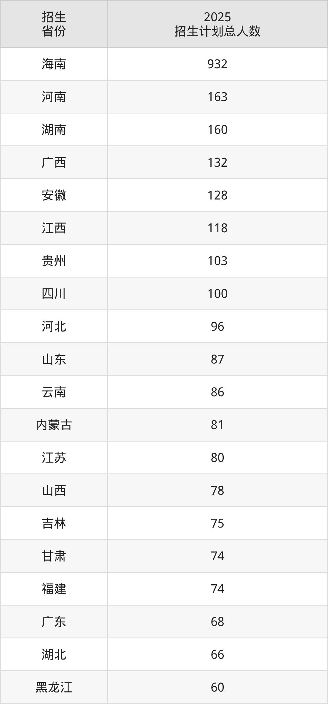 2025年海南热带海洋学院面向全国27个省市开展本科招生;招生专业共38个,招生人数共3005人。2025年在海南省招生计划总人数是932人,其中,海南热带海洋学院在海南省招生人数最多的是酒店管理。海南热带海洋学院在各省具体招生人数情况如下表。
