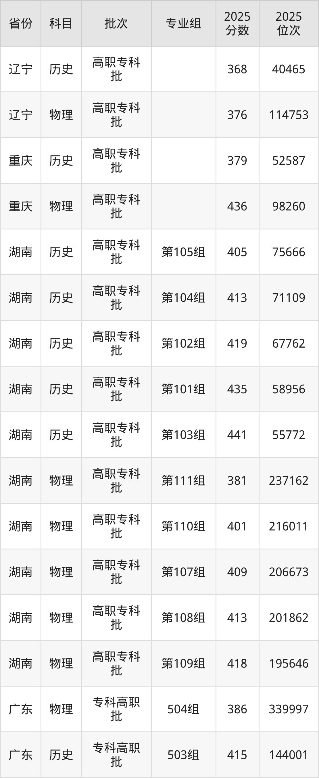 湖南科技职业学院专业组101:2025年投档录取最低分为389分,录取最低位次为247800名。