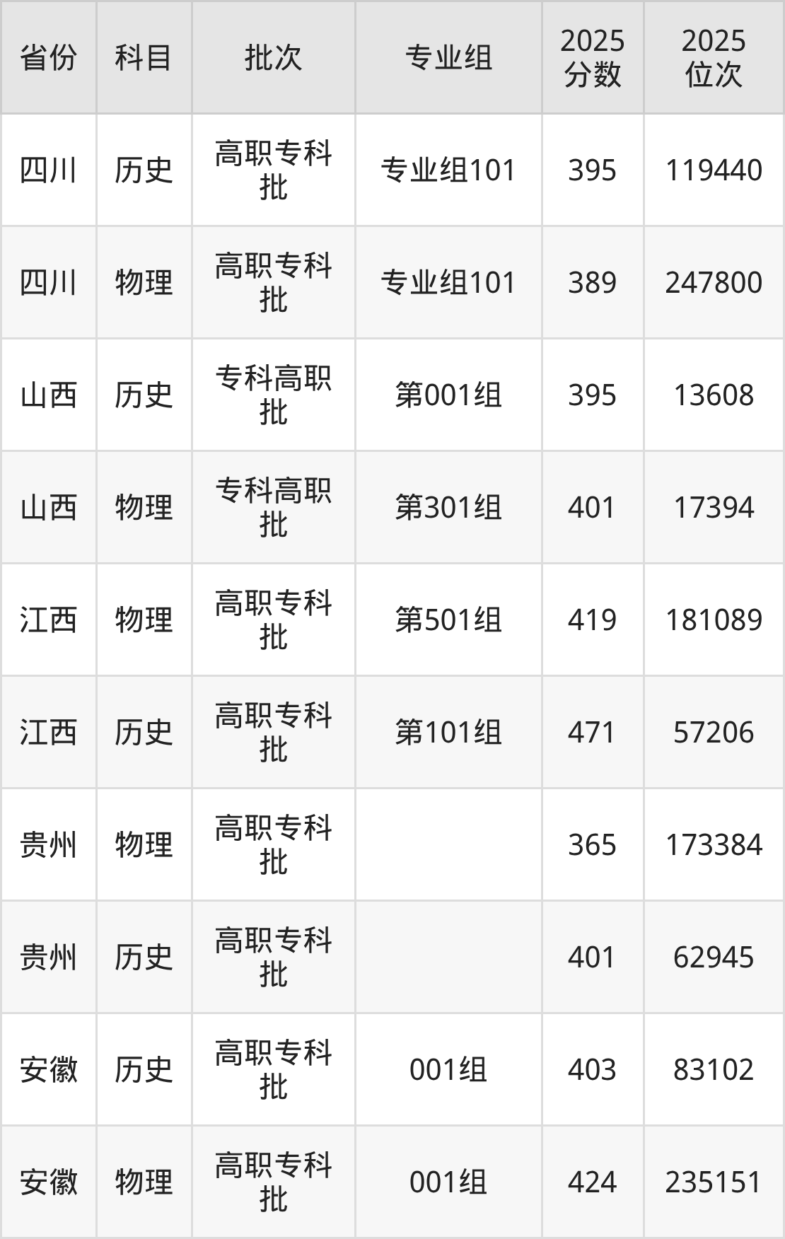 2025年湖南科技职业学院全国录取分数线是365分到471分,录取最低在贵州物理类、录取最高在江西历史类(第101组)。各省各专业组最低分具有差异,详情如下:
