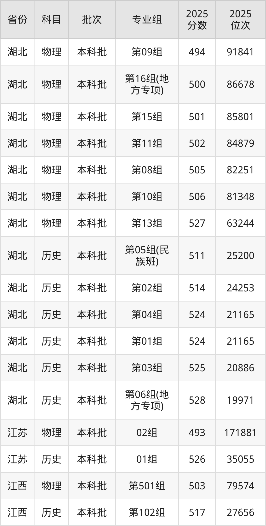 湖北文理学院001专业组:2025年投档录取最低分为494分,录取最低位次为9171名。