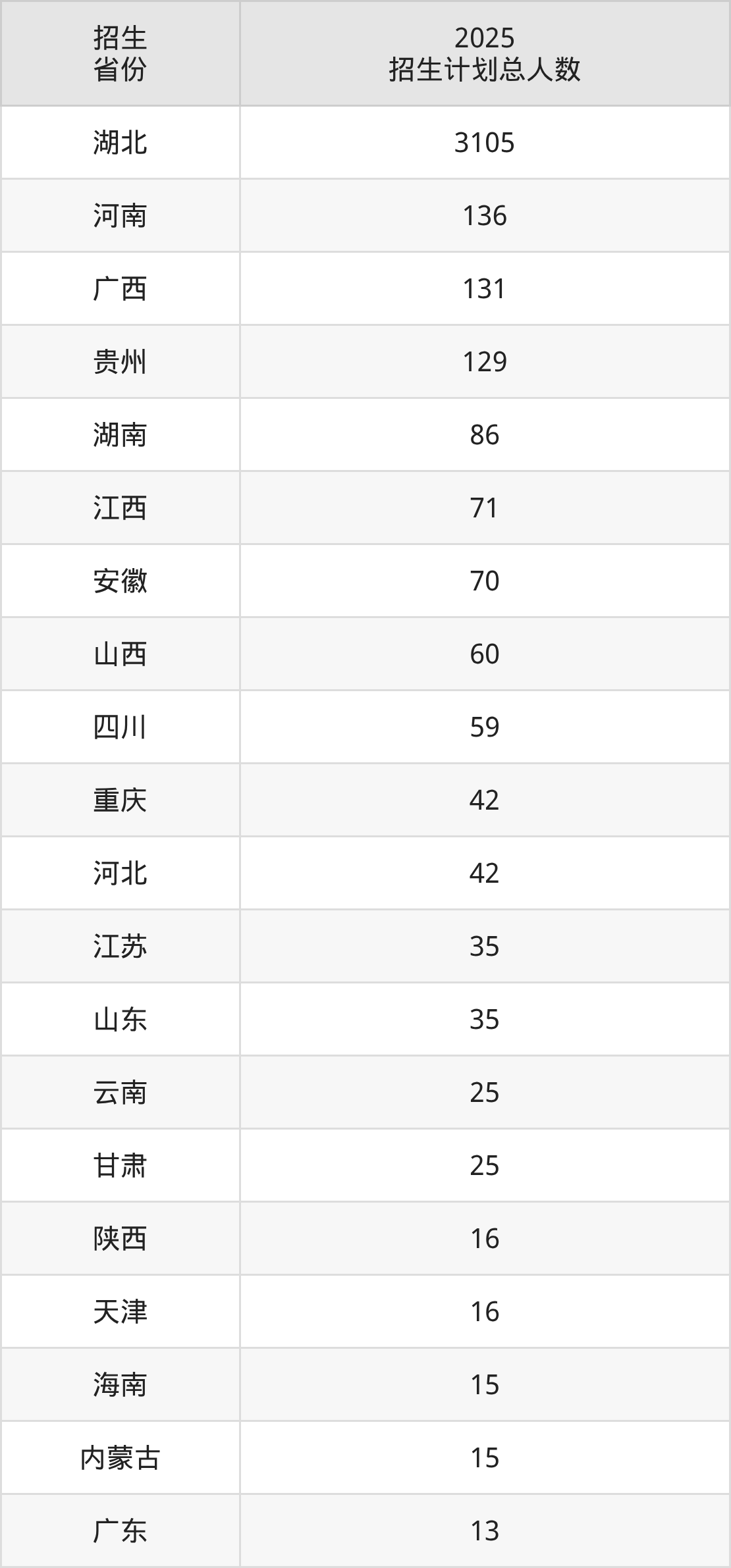 2025年湖北文理学院面向全国27个省市开展本科招生;招生专业共37个,招生人数共4179人。2025年在湖北省招生计划总人数是3105人,其中,湖北文理学院在湖北省招生人数最多的是数学类。湖北文理学院在各省具体招生人数情况如下表。