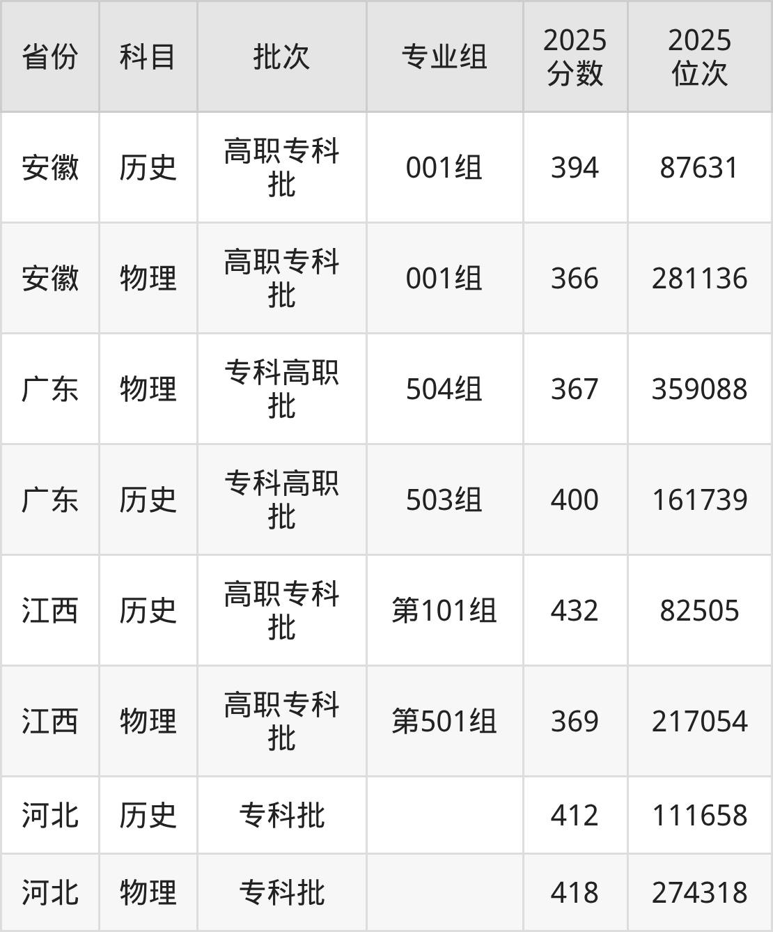 2025年淮北职业技术学院全国录取分数线是366分到470分,录取最低在安徽物理类(001组)、录取最高在河北历史类。各省各专业组最低分具有差异,详情如下: