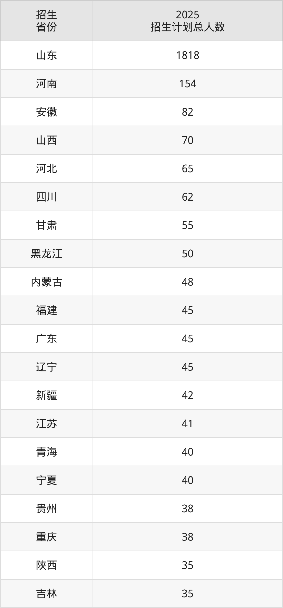 2025年山东协和学院面向全国24个省市开展本科招生;招生专业共37个,招生人数共2959人。2025年在山东省招生计划总人数是1818人,其中,山东协和学院在山东省招生人数最多的是护理学。山东协和学院在各省具体招生人数情况如下表。