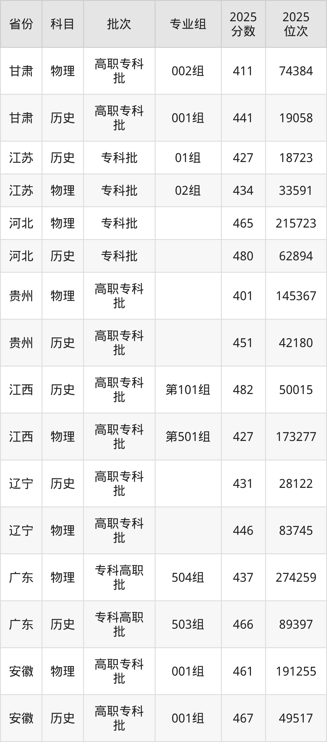普通类专科物理类最低401分,专科历史类最低451分