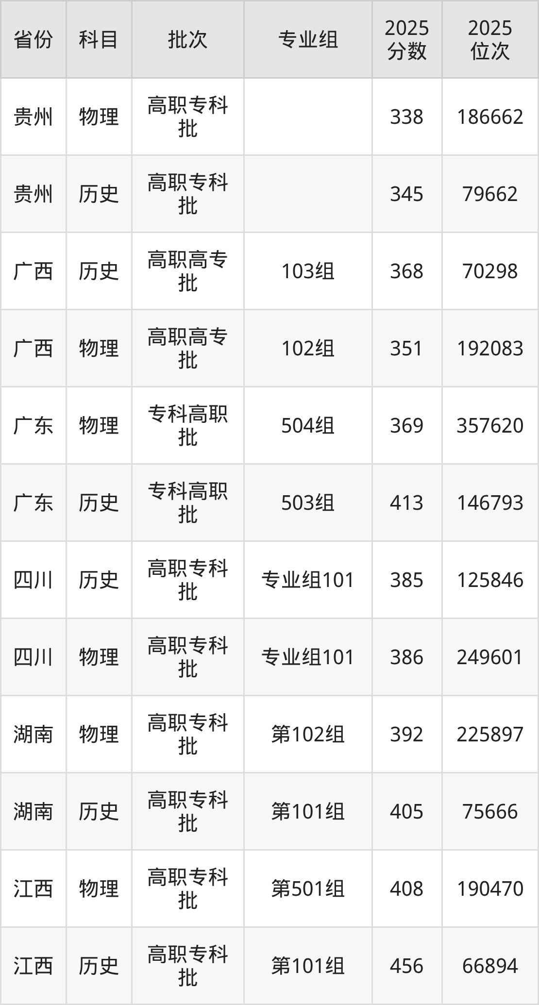 普通类专科物理类最低369分,专科历史类最低413分