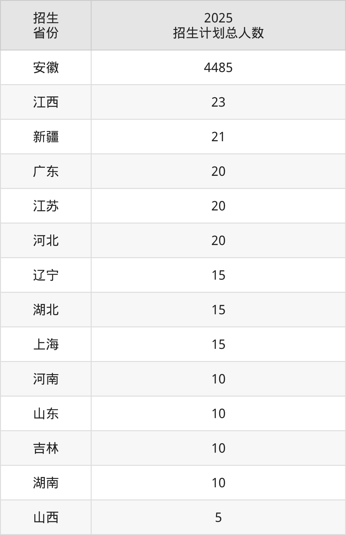 2025年滁州学院面向全国14个省市开展本科招生;招生专业共43个,招生人数共4679人。2025年在安徽省招生计划总人数是4485人,其中,滁州学院在安徽省招生人数最多的是经济统计学。滁州学院在各省具体招生人数情况如下表。