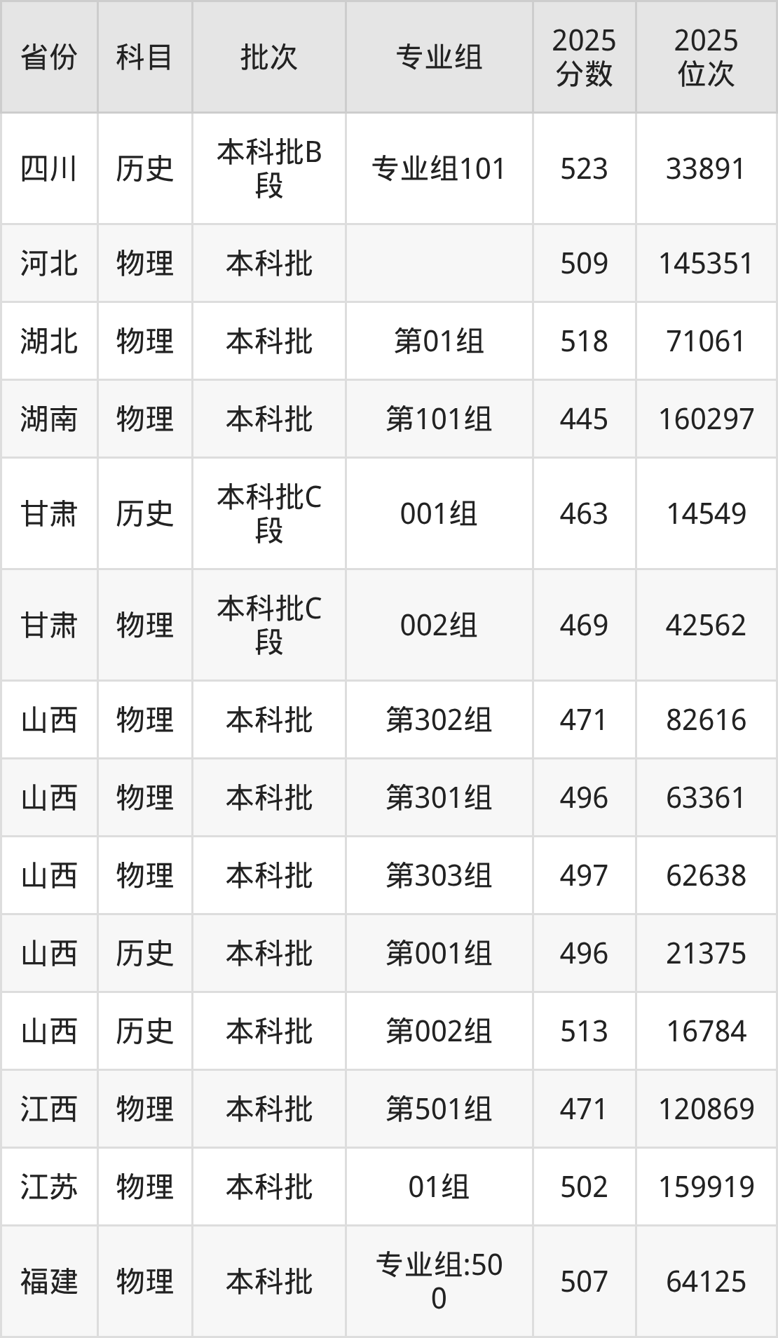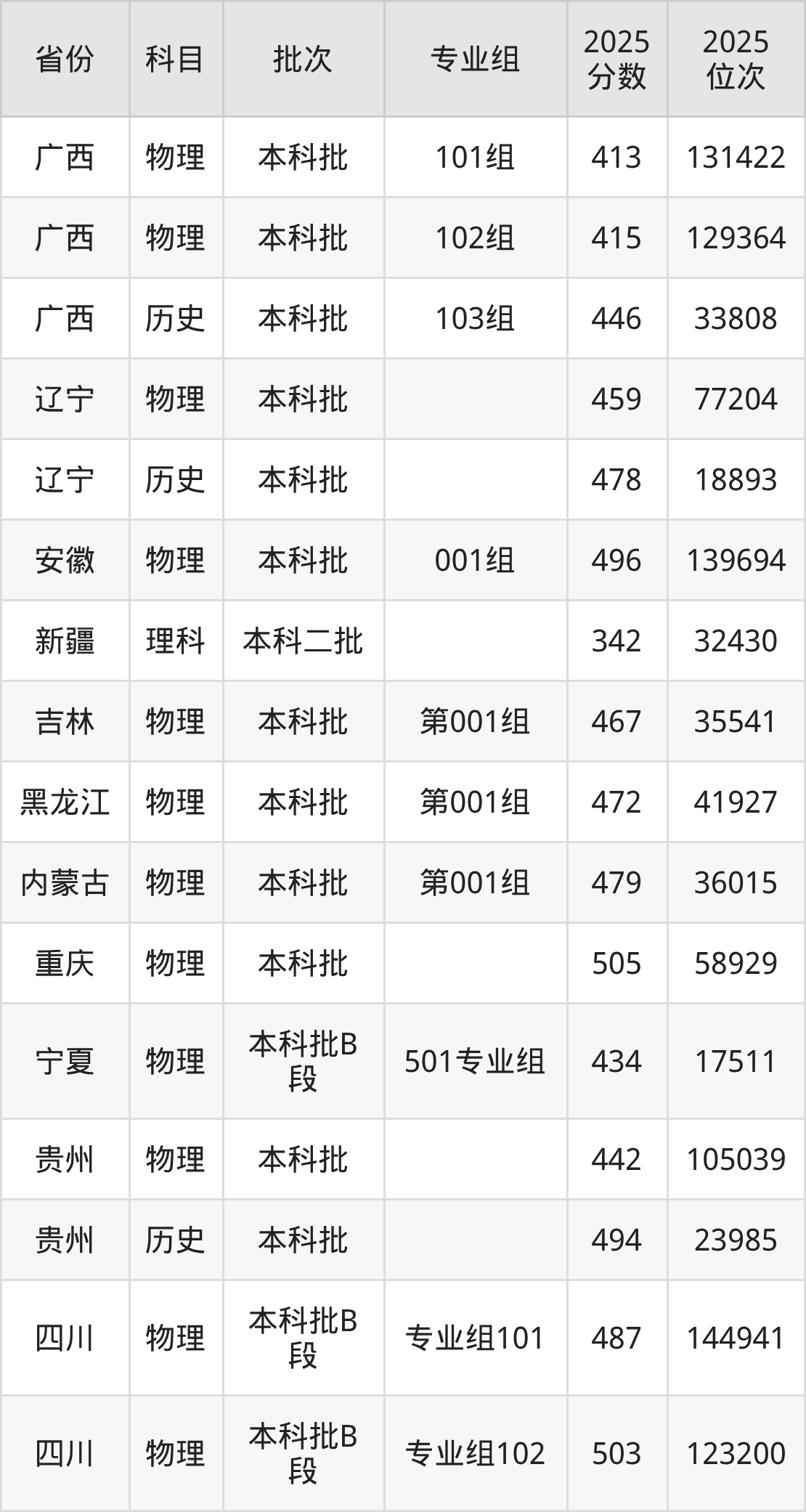 2025年在本科物理类进行招生,各专业组分数线详情如下: