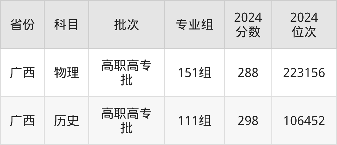 2024年玉林职业技术学院全国录取分数线是288分到298分,录取最低在广西物理类(151组)、录取最高在广西历史类(111组)。各省各专业组最低分具有差异,详情如下: