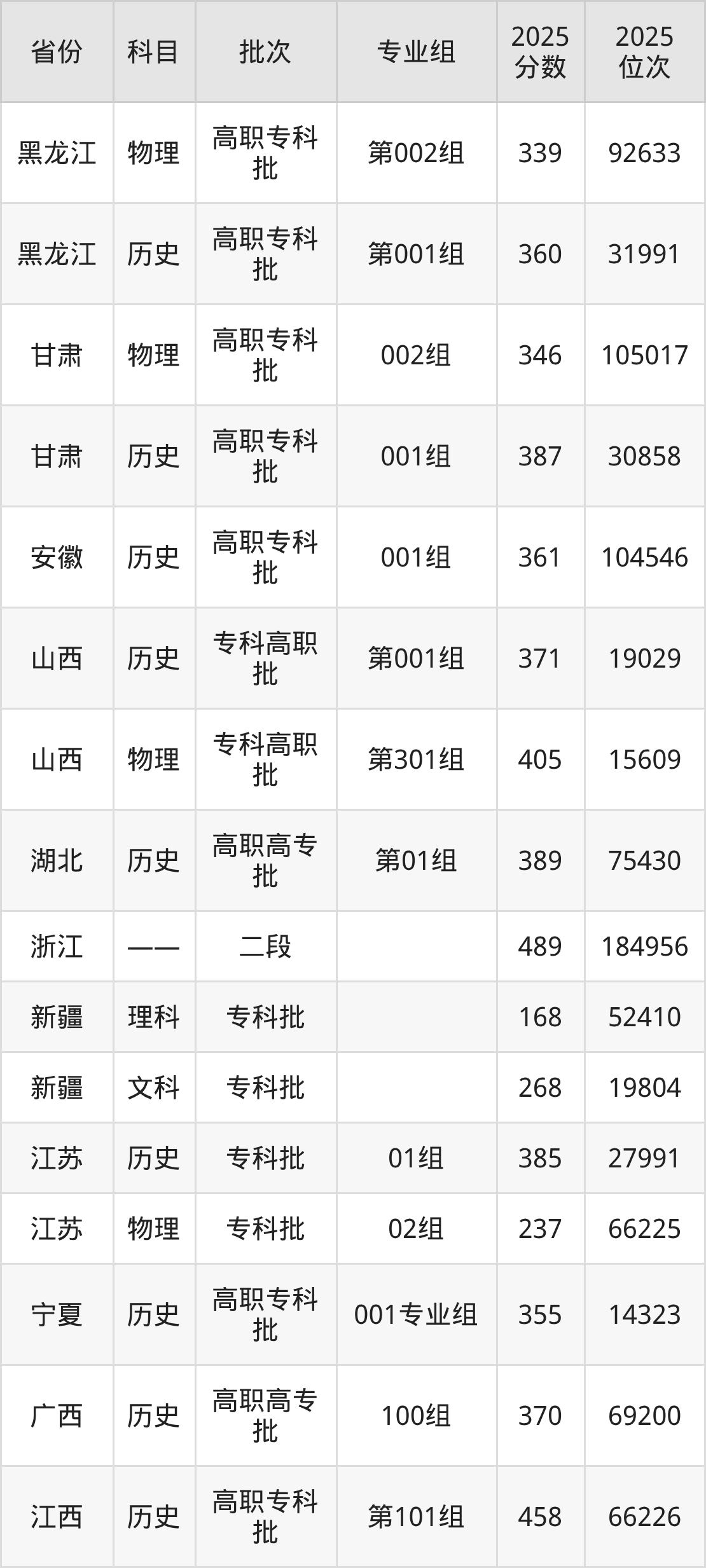 普通类专科物理类最低346分,专科历史类最低387分
