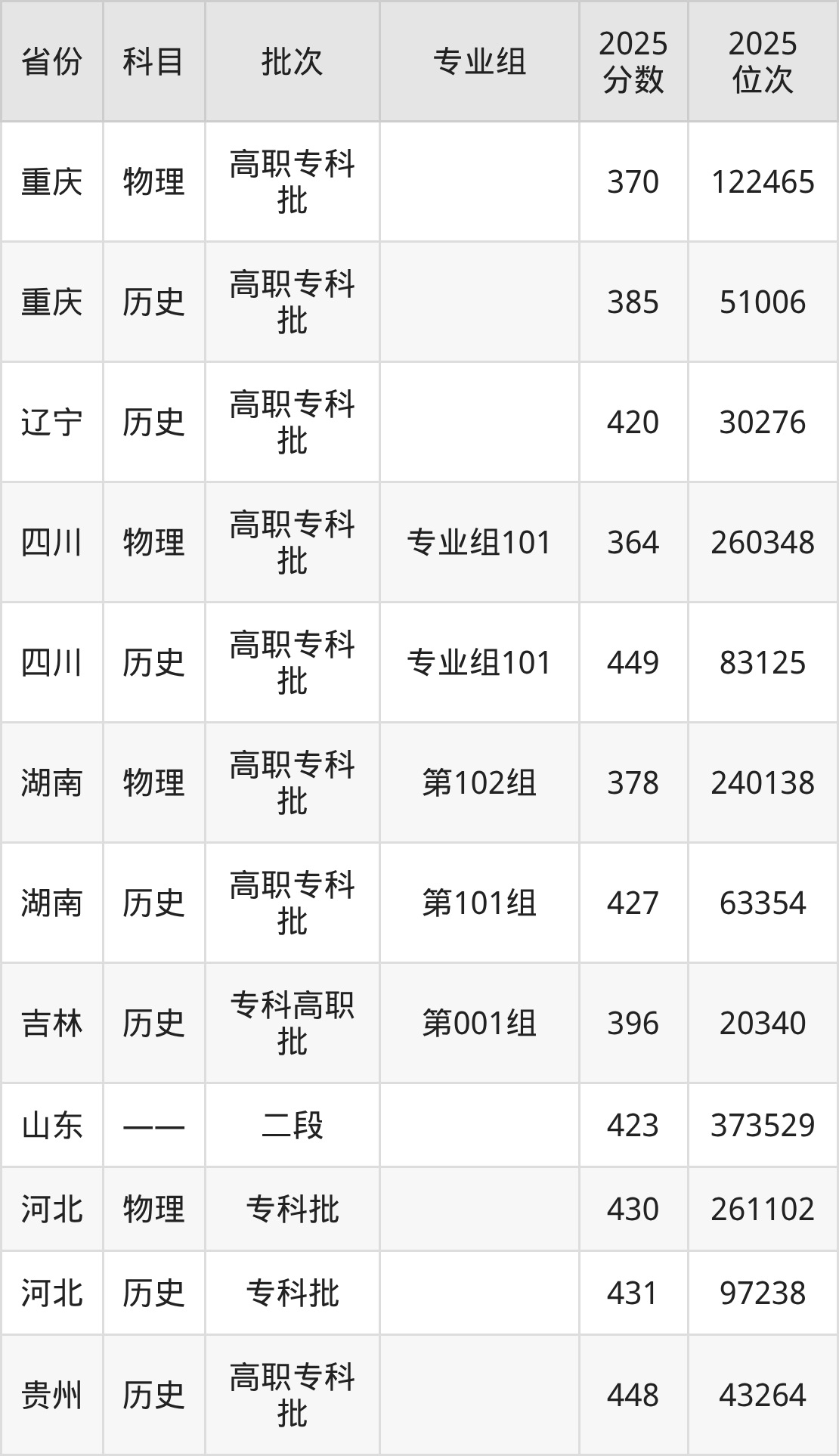 四川文化产业职业学院专业组101:2025年投档录取最低分为449分,录取最低位次为83125名。