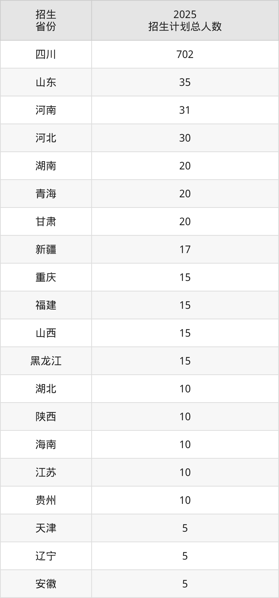 2025年四川文化产业职业学院面向全国24个省市开展专科招生;招生专业共27个,招生人数共1020人。2025年在四川省招生计划总人数是702人,其中,四川文化产业职业学院在四川省招生人数最多的是中文。四川文化产业职业学院在各省具体招生人数情况如下表。