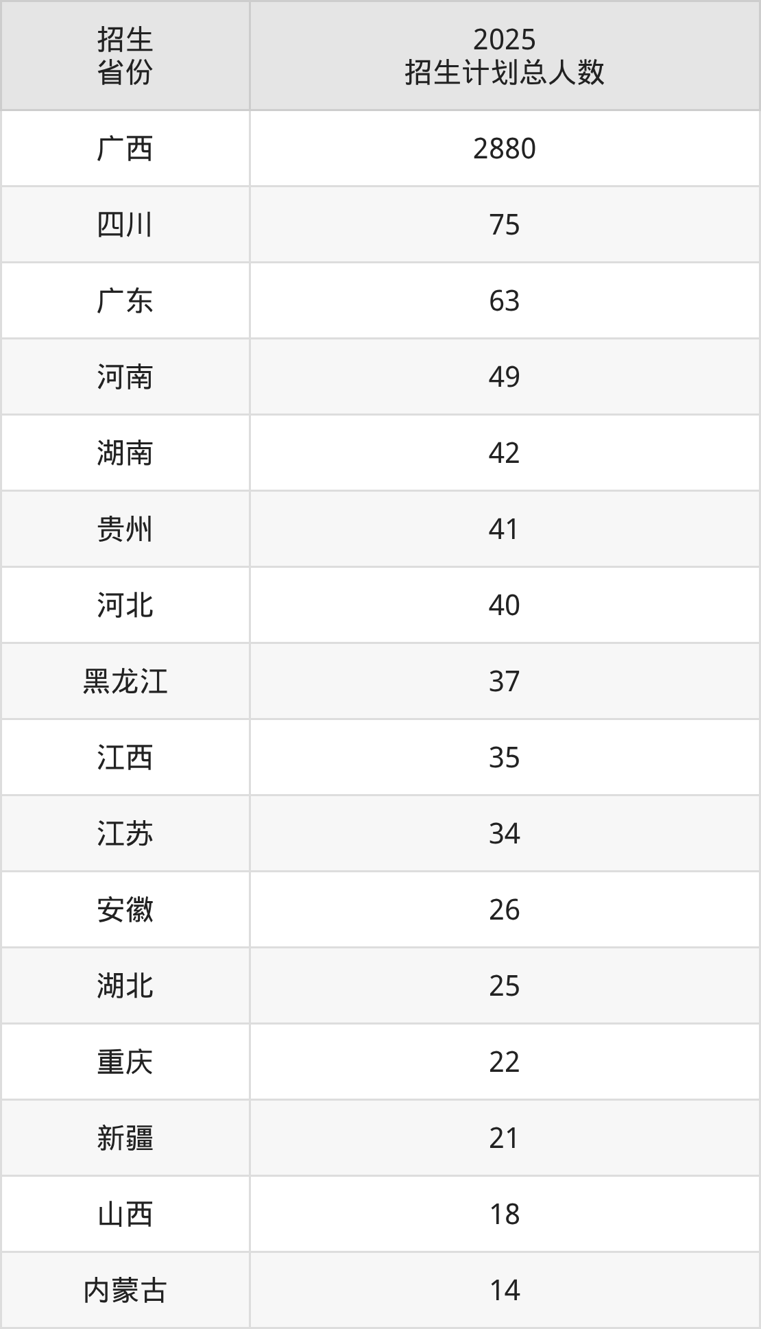 2025年桂林旅游学院面向全国24个省市开展本科招生;招生专业共25个,招生人数共2303人。2025年在广西壮族自治区招生计划总人数是2880人,其中,桂林旅游学院在广西壮族自治区招生人数最多的是数据科学与大数据技术。桂林旅游学院在各省具体招生人数情况如下表。
