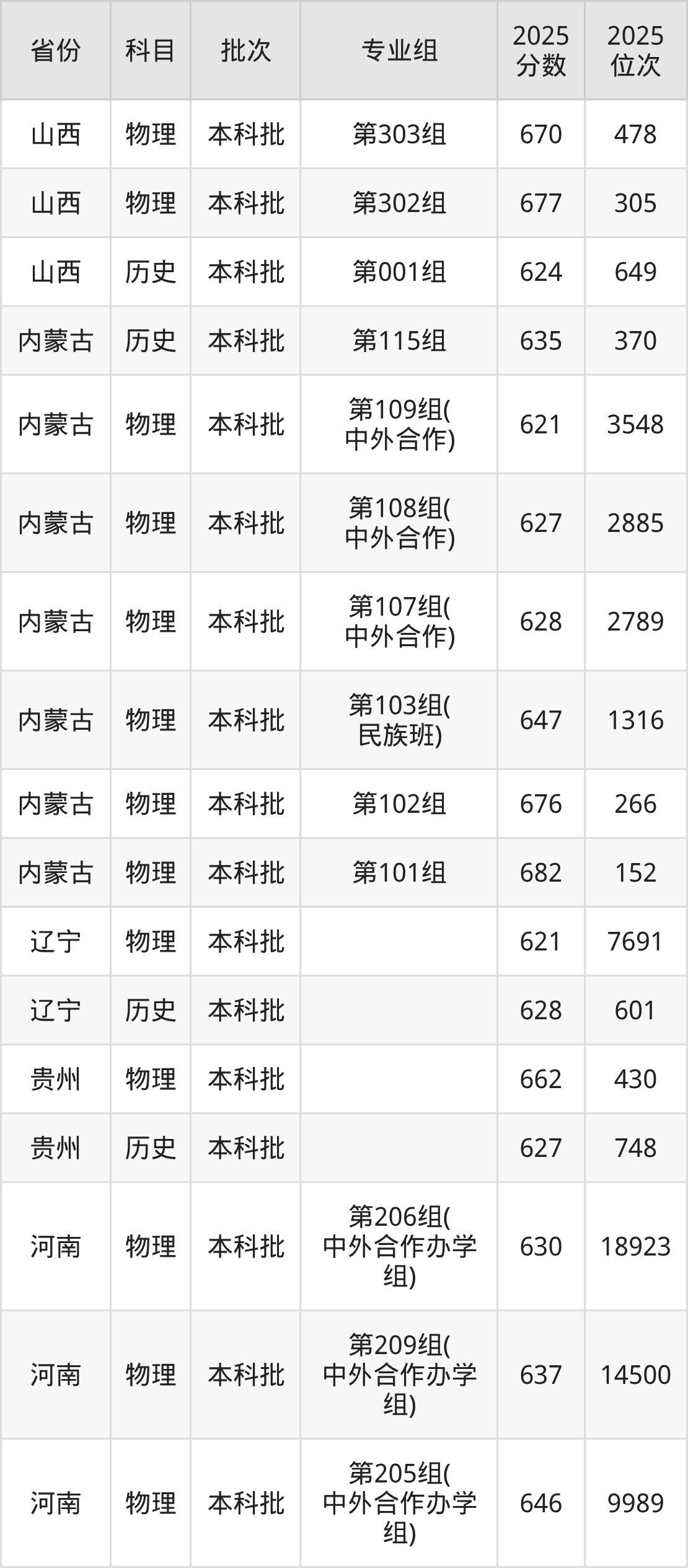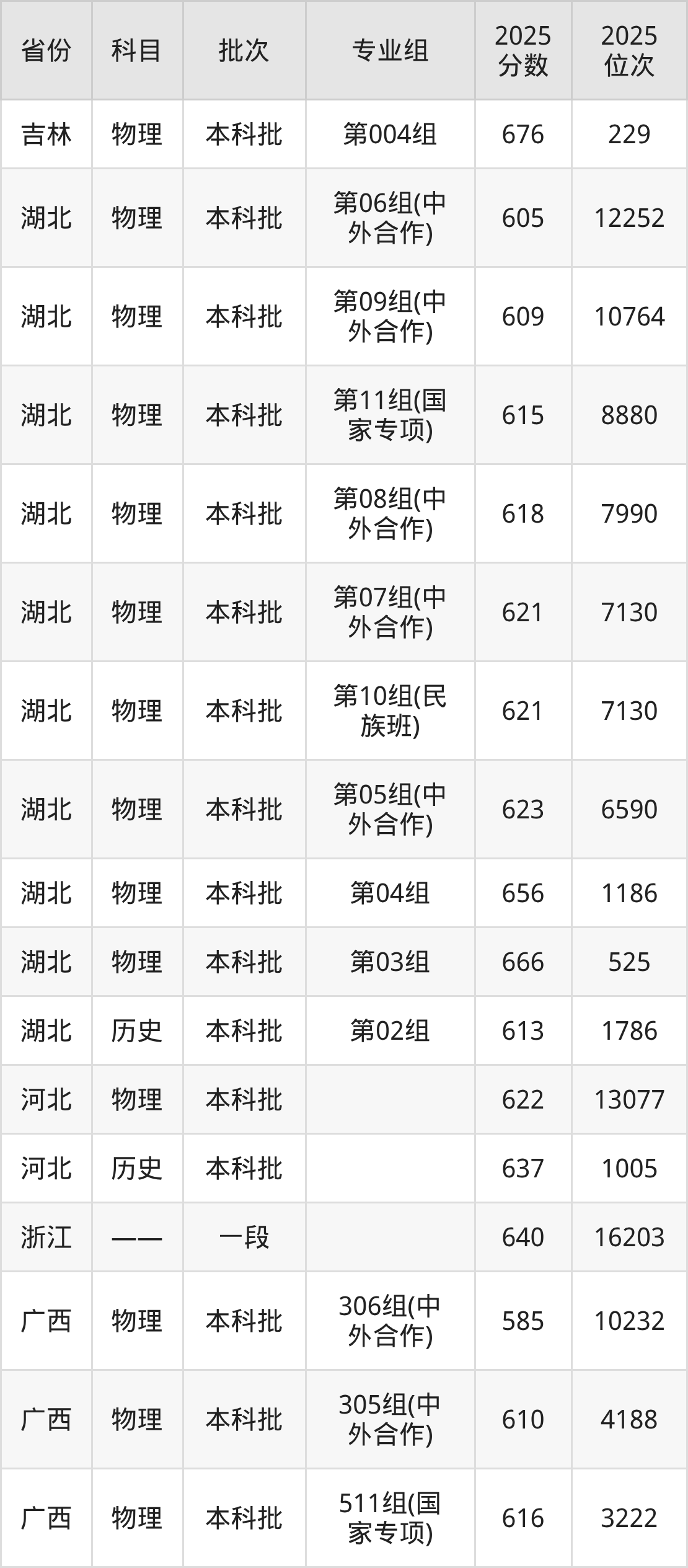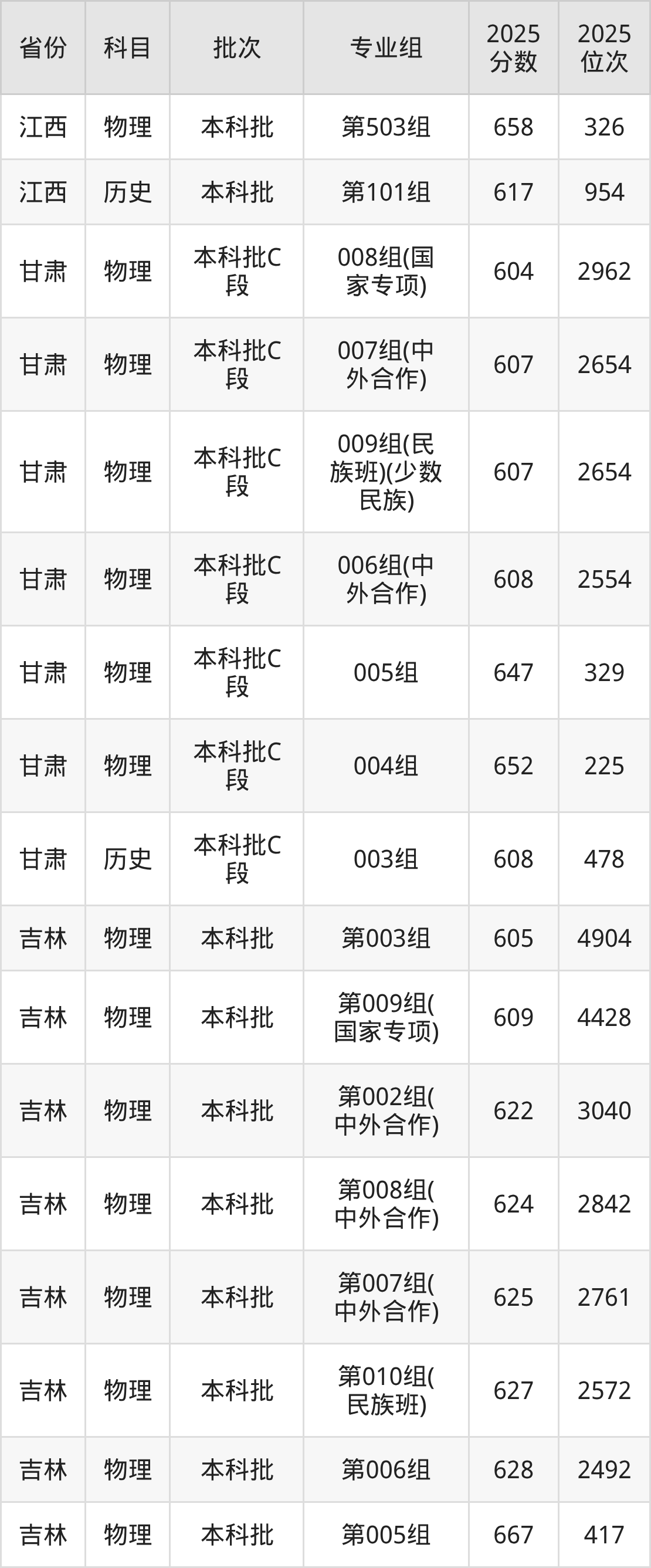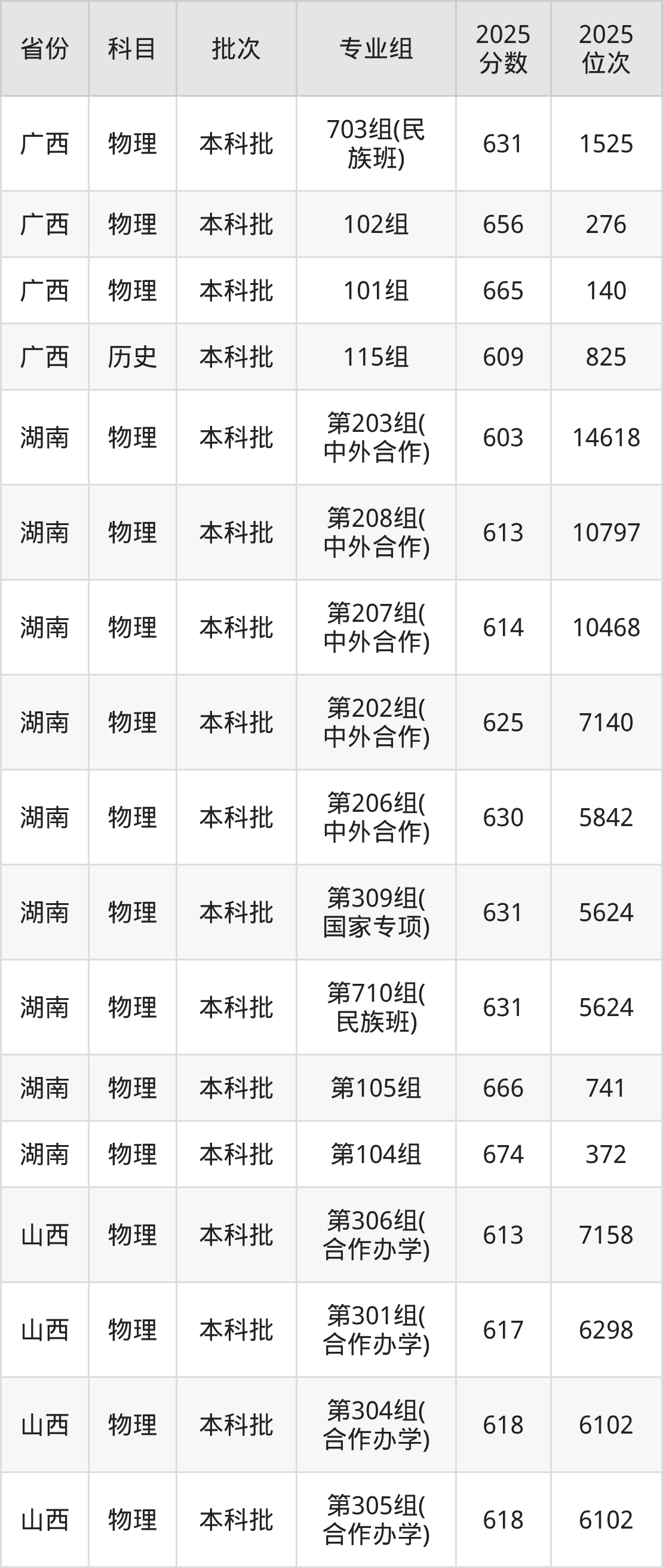 2025年在本科物理类进行招生,各专业组分数线详情如下: