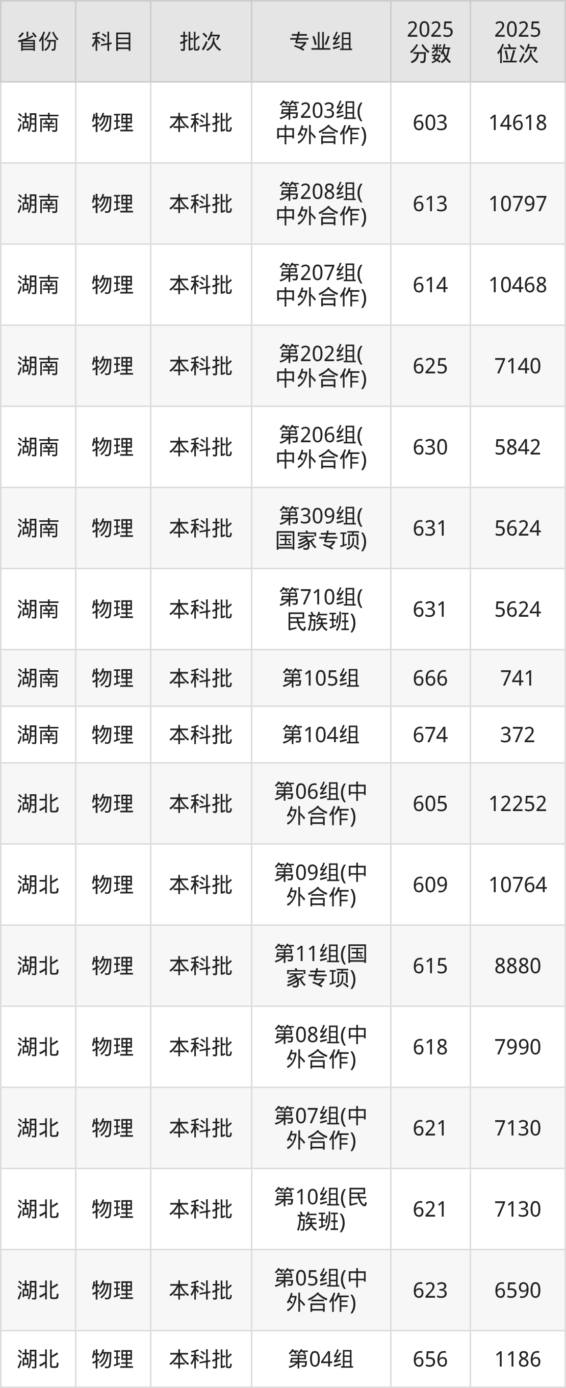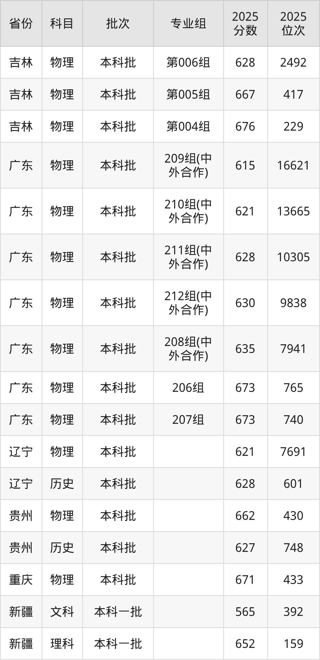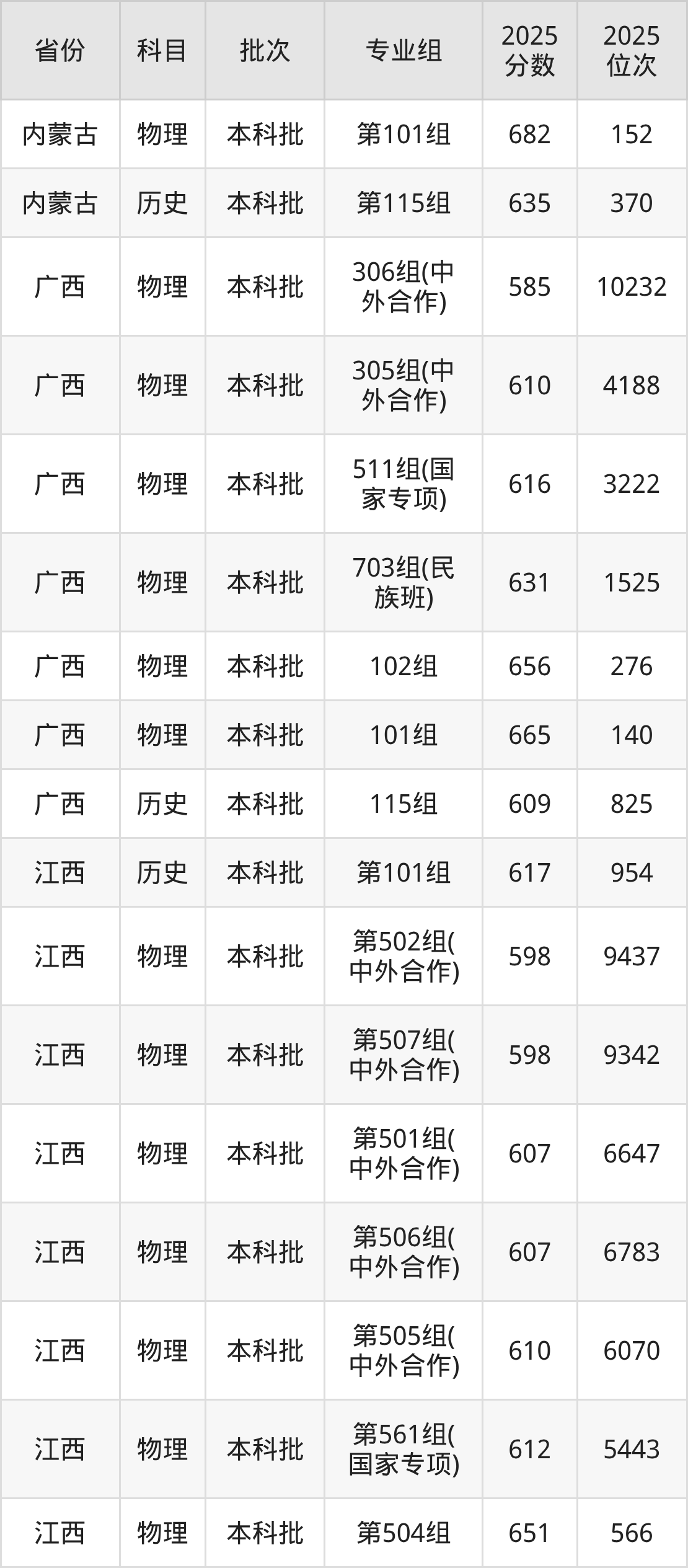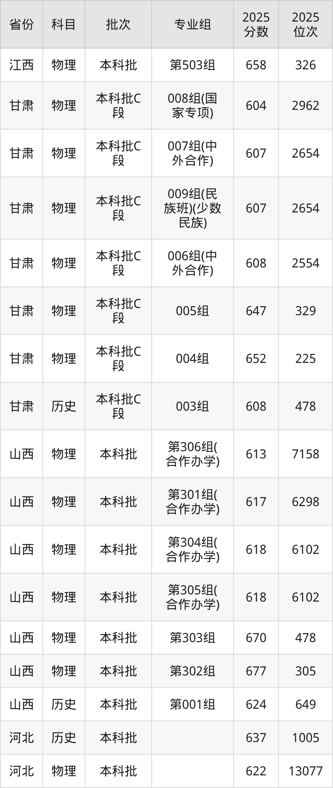 2025年在本科物理类进行招生,各专业组分数线详情如下: