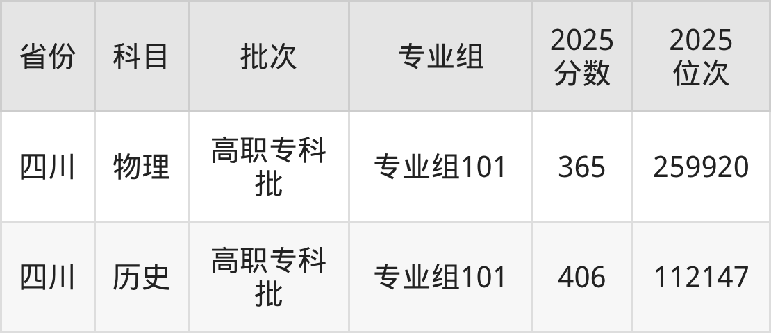四川信息职业技术学院专业组101:2025年投档录取最低分为365分,录取最低位次为259920名。